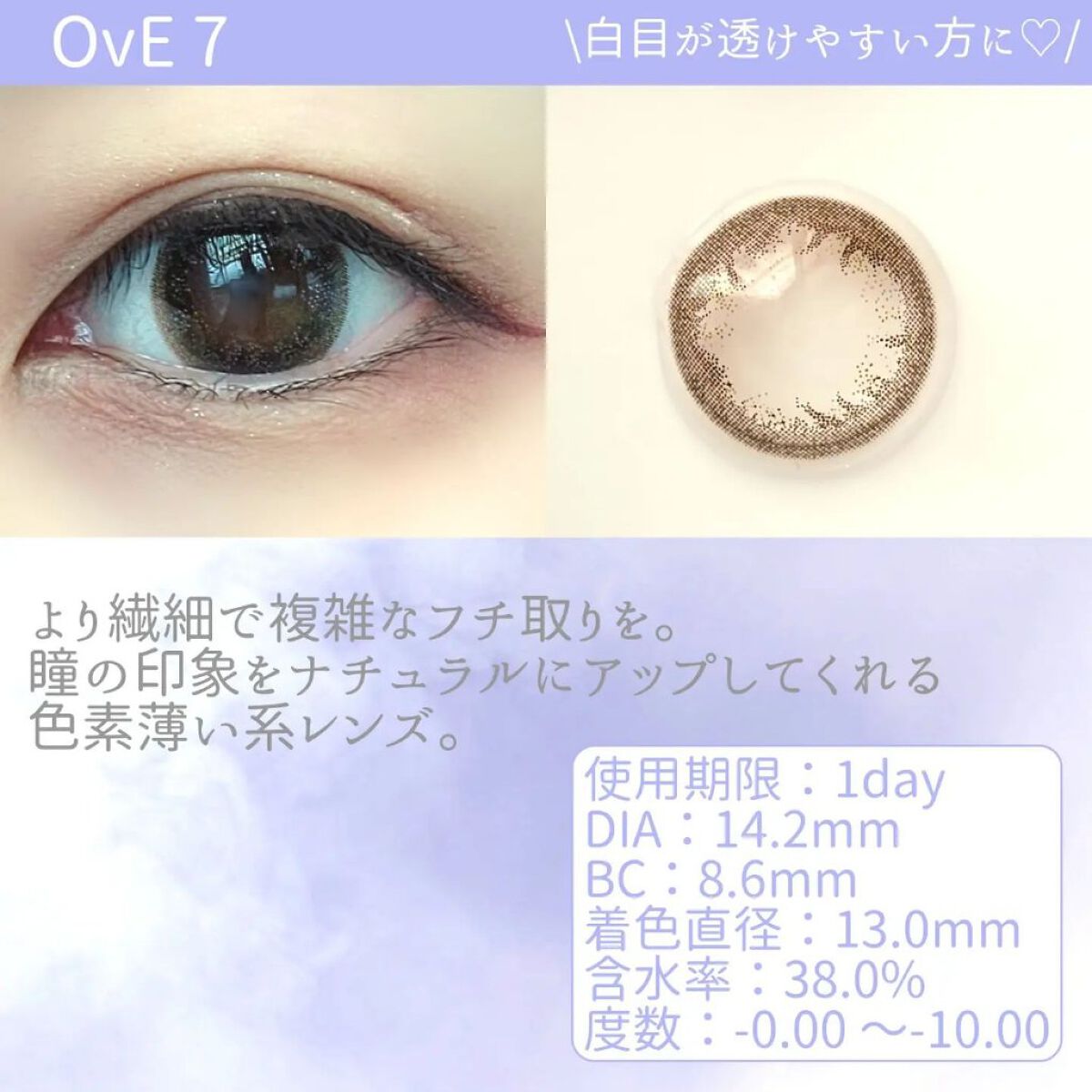 - 「左右⾮対称なデザイン」で「本来の⾃分の瞳の輝きを⽣かす」「⾊」ではなく、瞳に⼊る「光」を再現した今までとは異なる発想のこだわりデザインレンズ ⿊⽬を⼤きく、瞳を⾊付けることを⽬的とした従来のカラーコンタクトレンズとは異なる発想で、瞳の中でキラキラと輝く光を表現し、透明感と潤いに溢れた瞳を実現。 繊細な⾊合いとそれを左右⾮対称に配したデザインによって、柔らかく朗らかな印象を⾃然に演出します。 発光するような瞳は、視線を集めるので⼩顔感も期待できます。 着色直径 6:12.1mm、1~4,6,7:13.0mm、5,8:14.0mm 直径(DIA) 6:14.0mm、1~4,6,7:14.2mm、5,8:14.5mm ベースカーブ 1~5,7,8:8.6mm、6:8.7mm 度数 0.00、-0.50D〜-10.00D 含⽔率 38%