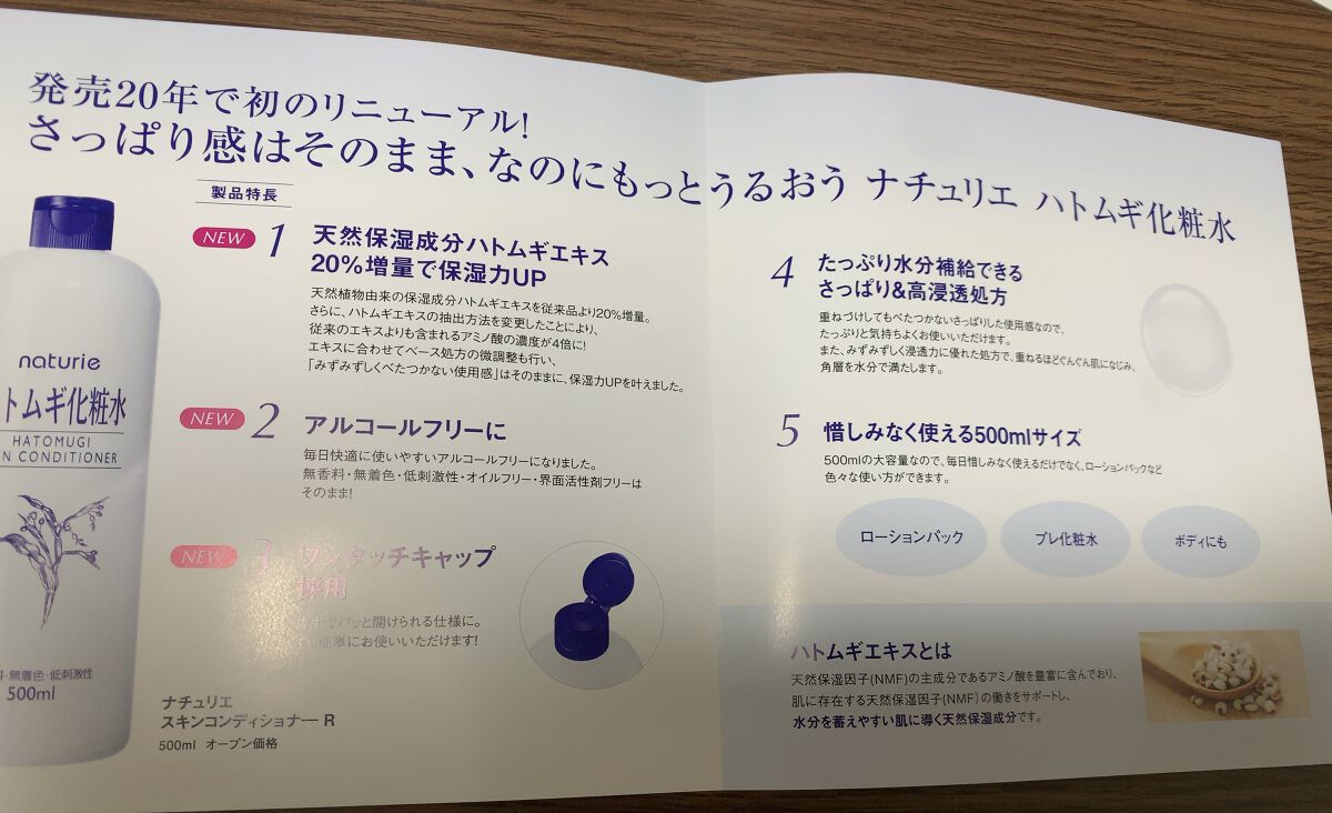 ハトムギエキス20%増量で保湿力UP →天然植物由来の保湿成分ハトムギエキスを従来品より20%増量 アルコールフリーに →毎日快適に使いやすいアルコールフリーになった テクスチャーはみずみずしくベタつかない 肌にスーッと馴染んでくれる