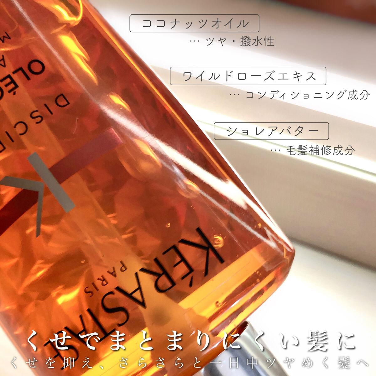 - くせ毛ケア くせを抑え、さらさらと一日中ツヤめく髪へ導くオイルタイプの洗い流さないヘアトリートメント ケラスターゼ史上初、日本の研究開発部門が開発したテクノロジーにより、湿度80%でも24時間まとまりが続く髪へ導きます。 ヤシ油(ツヤ・撥水性) プルケネチアボルビリス種子油(保湿成分)