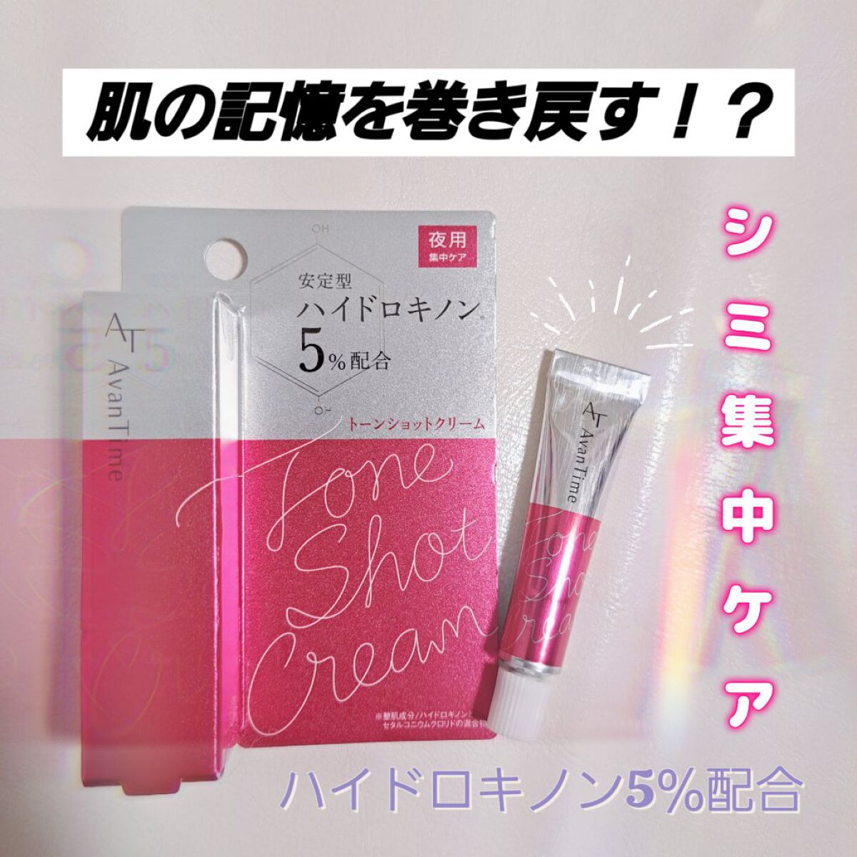 - 「アバンタイム トーンショットクリーム」は安定型ハイドロキノン SHQ-1を5%配合したクリームです。成分が徐々に溶け出しターゲットエリアにアプローチする製品設計であるため、肌にやさしく持続的な作用が期待できます。滑らかで密着しやすいクリームタイプなので、気になる部分を集中的にピンポイントケアすることが可能です。夜のスキンケアの最後に、お肌の気になるポイントにご使用ください。