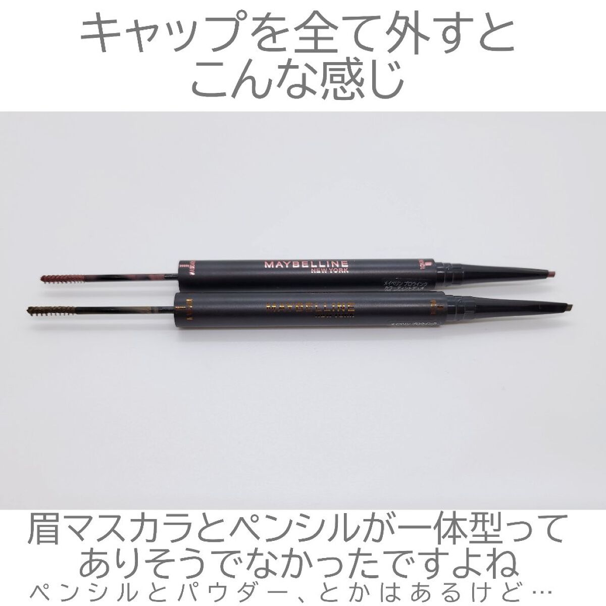 メイベリンのアイブロウペンシルとアイブロウマスカラが1本にまとまった便利なアイテム。 ほどほど細めの三角芯が描きやすいしアイブロウマスカラも細くて塗りやすく落ちにくい。 ただ、どっちを早く使い切るか…が問題。