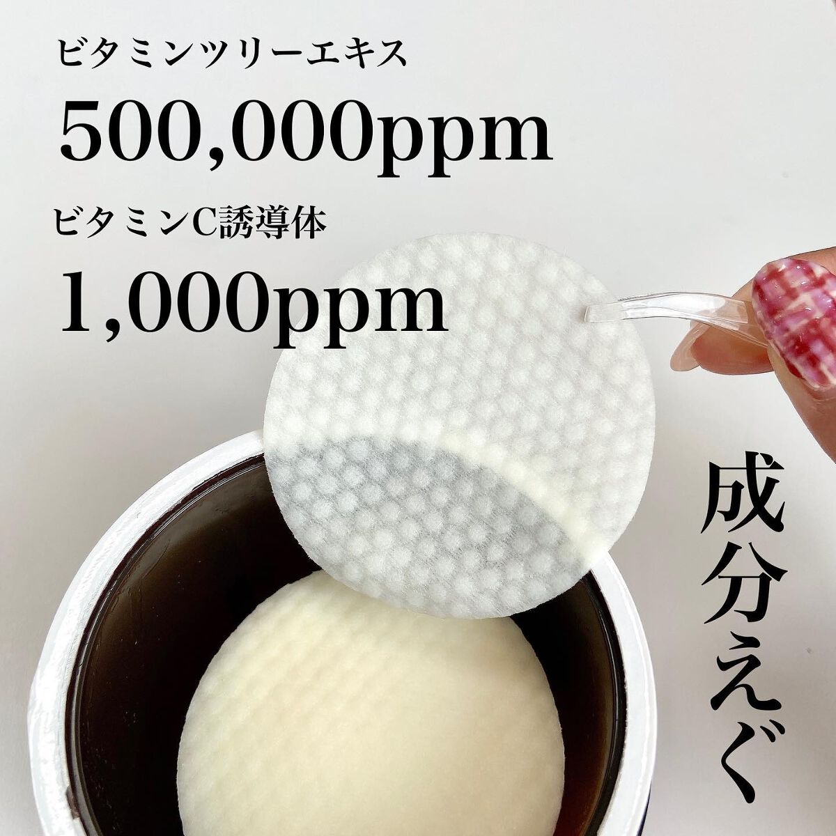 - 高濃縮ビタミンC*アンプルを贅沢に含んだパッドです。 ビタミン*をたっぷり肌の角質層まで浸透させ、拭き取りケアで乾燥によるくすみをケアしながら、肌にハリとツヤを与えます。 ☑*ビタミンツリー成分 500,000ppm+ビタミンC誘導体 1,000ppm配合(すべて整肌成分) ☑でこぼこ面で拭き取り、肌キメケア ☑なめらか面で保湿し、ツヤケア ☑トナーの代わりとして ☑肌の気になる部分にのせ、5~10分のパックとして ☑弱酸性で肌への負担が少ない使い心地で角質ケア ケアが必要な部分に約5~10分肌に当て、お肌のキメに沿いながら拭き取り、軽く叩きながらやさしくなじませます。 ■お肌に異常が生じていないかよく注意してご使用ください。化粧品がお肌に合わないとき即ち次のような場合には、使用を中止してください。そのまま使 用を続けますと、症状を悪化させることがありますので、皮膚科専門医等にご相談されることをおすすめします。また、傷やはれもの、しっしん等の異常が ある部位には、ご使用にならないでください。 (1)使用中、赤み、はれ、かゆみ、刺激、色抜け(白斑等)や黒ずみ等の異常があらわれた場合 (2)使用したお肌に、直射日光があたって上記のような異常があらわれた場合 ■目に入らないようご注意ください。目に入ったときは、こすらずにすぐに洗い流してください。その後、目に異常が残る場合は、眼科専門医へご相談され ることをおすすめします。 ■極端に高温又は低温の場所、低湿、高湿の場所、直射日光のあたる場所には保管しないでください。 ■衣類につくと、しみになることがございますのでご注意ください。 ■乳児、子供の手の届かない所に保管してください。 ■ご使用後はパッドが乾かない様、蓋をきちんと閉めて保管してください。