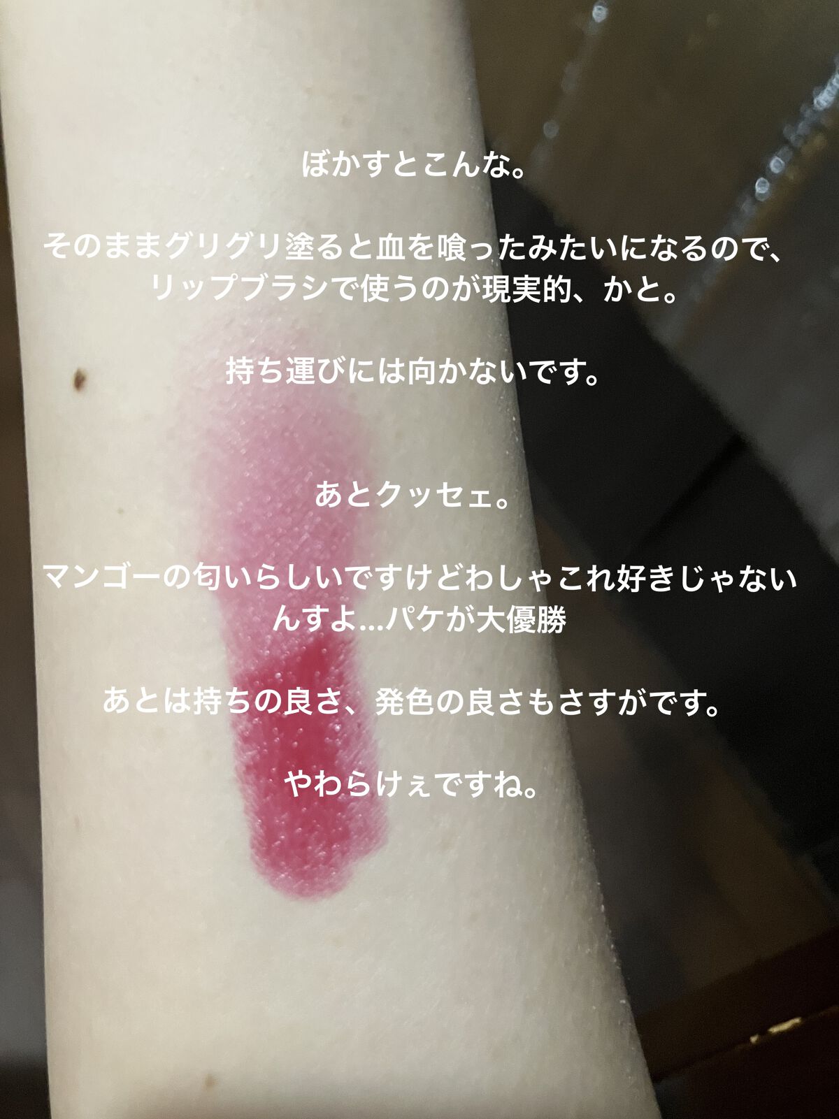 【色もち】あまり良くはないかも!スウォッチのために腕につけた時も、水でちゅるちゅる落ちた。 【保湿】完璧です。もっちり。リップクリームとして使ってもいいくらい。 【良いところ】いい香り。色味も可愛い。質感もいい。全てや。