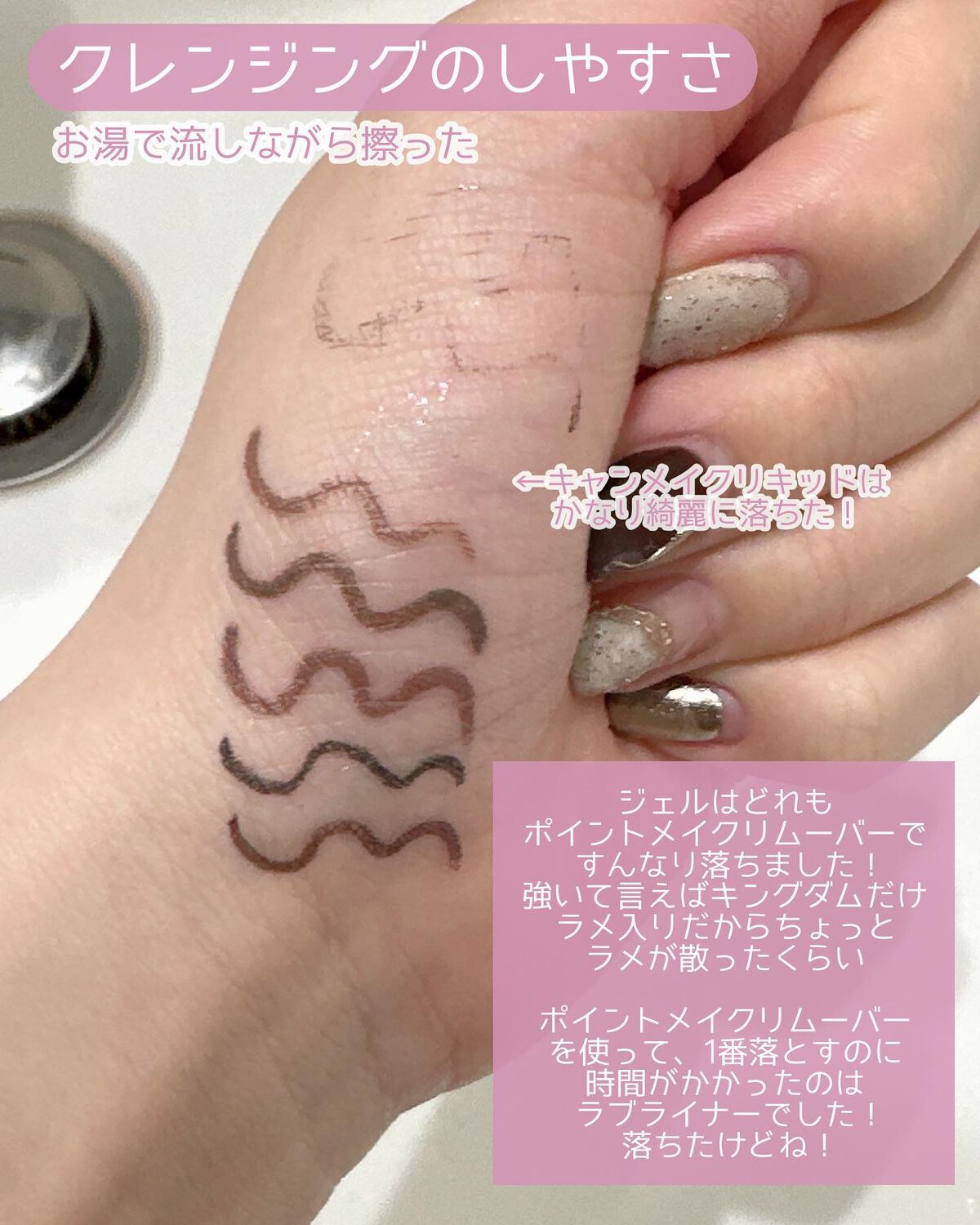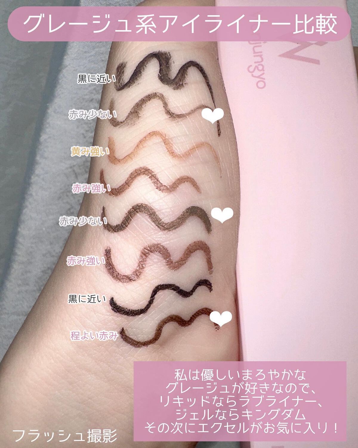 ★ラブライナーは筆が太くしなやかなので、そのまま塗ると、太めになってしまいます。細く描くのは私の技術的に無理があり、他のライナーをぼかす時に上から使用してます。擦れには強いです。★インテグレートは細く綺麗に描けます。色も濃くとても綺麗です。 ...