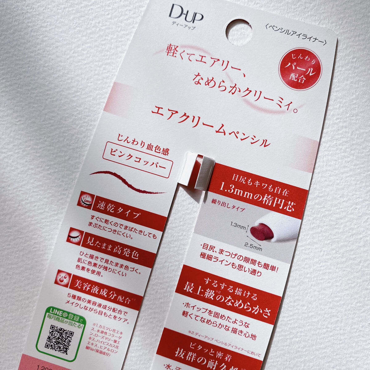 - ※2024年9月〜パッケージ順次リニューアル。尚、これにかかる商品の返品・交換は承っておりません。 「軽くてエアリー、なめらかクリーミィ」 ホイップを固めたような“ふわとろ”質感の新アイライナー ▶摩擦を抑えた描き心地!触れるだけで“スーッ”とほどける「空気感タッチ」 なめらかな描き心地で、まつ毛の隙間や肌の凹凸に引っかからずに狙い通りにラインが描ける。 ▶新形状の極細楕円芯!「キワ埋め」も「目尻」も自在 狙った場所に自在に描ける「1.3㎜×2.5㎜」の新形状。極細ラインもテクニックレス。 ▶ピタッと高密着!高い耐久性。水汗皮脂に強いスーパーウォータープルーフ* まぶたにピタッと密着して、マスクでもよれにくい。 *ディーアップ アイライナーにおいて ・シナモンブラウン “肌になじむ、柔らか 抜け感くすみブラウン” 抜け感と締め感を両立し、ナチュラルに盛れる ・ピーチブラウン “ビターなほんのり赤み系ブラウン” まるでまつ毛の密度が上がったように、自然に目元を大きく見せる ・ソイラテブラウン (2022年10月9日発売) 肌にふわっと溶け込む、まろやかな“ラテカラー” 軽やかなのに深みのある色味で自然と瞳を強調