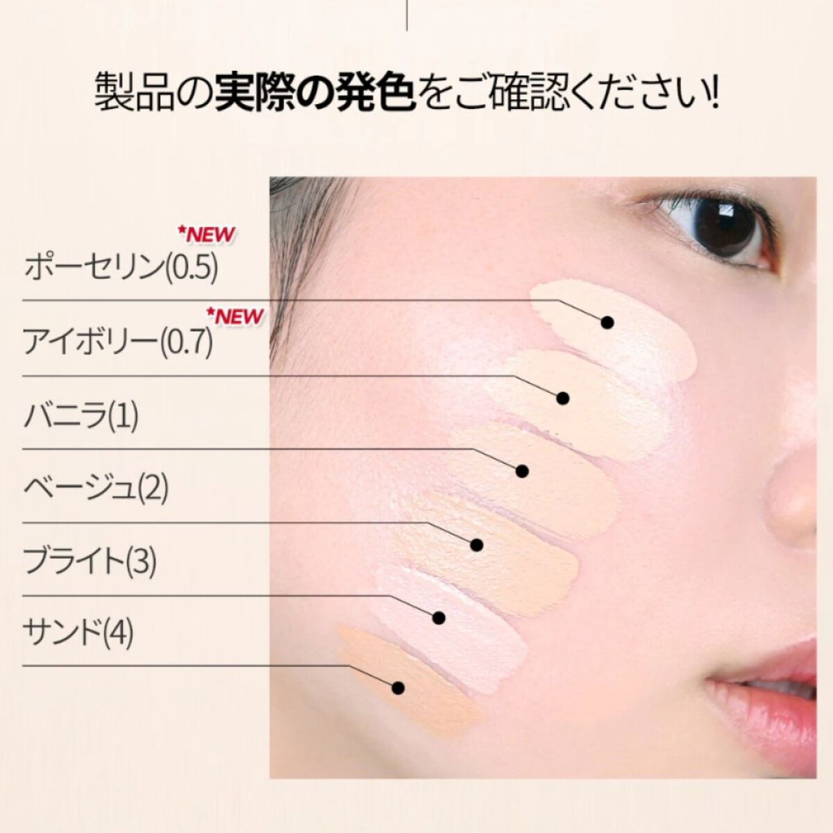 - <0.5 ポーセリン> 水、シクロペンタシロキサン、フェニルトリメチコン、タルク、セチルPEG/PPG-10/1ジメチコン、BG、PVP、ナイアシンアミド、(ビニルジメチコン/メチコンシルセスキオキサン)クロスポリマー、PEG-10ジメチコン、塩化Na、ジステアルジモニウムヘクトライト、トリエトキシカプリリルシラン、水酸化Al、p-アニス酸、カプリル酸グリセリル、パルミチン酸、ジメチコン、ステアリン酸、アデノシン、ツボクサエキス、スベリヒユエキス、カミツレ花エキス、セイヨウニンジンボク果実エキス、ヒポファエラムノイデス果実エキス、香料、酸化チタン、酸化鉄 <0.7 アイボリー> 水、シクロペンタシロキサン、フェニルトリメチコン、タルク、セチルPEG/PPG-10/1ジメチコン、BG、PVP、ナイアシンアミド、(ビニルジメチコン/メチコンシルセスキオキサン)クロスポリマー、PEG-10ジメチコン、塩化Na、ジステアルジモニウムヘクトライト、トリエトキシカプリリルシラン、水酸化Al、p-アニス酸、カプリル酸グリセリル、パルミチン酸、ジメチコン、ステアリン酸、アデノシン、ツボクサエキス、スベリヒユエキス、カミツレ花エキス、セイヨウニンジンボク果実エキス、ヒポファエラムノイデス果実エキス、香料、酸化チタン、酸化鉄 <01 バニラ> 水、シクロペンタシロキサン、フェニルトリメチコン、タルク、セチルPEG/PPG-10/1ジメチコン、BG、PVP、ナイアシンアミド、(ビニルジメチコン/メチコンシルセスキオキサン)クロスポリマー、PEG-10ジメチコン、塩化Na、ジステアルジモニウムヘクトライト、トリエトキシカプリリルシラン、水酸化Al、p-アニス酸、カプリル酸グリセリル、パルミチン酸、ステアリン酸、ジメチコン、アデノシン、ツボクサエキス、スベリヒユエキス、カミツレ花エキス、セイヨウニンジンボク果実エキス、ヒポファエラムノイデス果実エキス、香料、酸化チタン、酸化鉄 <02 ベージュ> 水、シクロペンタシロキサン、フェニルトリメチコン、タルク、セチルPEG/PPG-10/1ジメチコン、BG、PVP、ナイアシンアミド、(ビニルジメチコン/メチコンシルセスキオキサン)クロスポリマー、PEG-10ジメチコン、塩化Na、ジステアルジモニウムヘクトライト、トリエトキシカプリリルシラン、水酸化Al、p-アニス酸、カプリル酸グリセリル、パルミチン酸、ステアリン酸、ジメチコン、アデノシン、ツボクサエキス、スベリヒユエキス、カミツレ花エキス、セイヨウニンジンボク果実エキス、ヒポファエラムノイデス果実エキス、香料、酸化チタン、酸化鉄 <03 ブライト> 水、シクロペンタシロキサン、酸化チタン、炭酸ジエチルヘキシル、BG、ネオペンタン酸イソデシル、PEG-10ジメチコン、グリセリン、安息香酸アルキル(C12-15)、(VP/ヘキサデセン)コポリマー、ナイアシンアミド、クオタニウム-18ベントナイト、セスキオレイン酸ソルビタン、塩化Na、ミツロウ、シリカ、(ジメチコン/ビニルジメチコン)クロスポリマー、トリエトキシカプリリルシラン、水酸化Al、1,2-ヘキサンジオール、カプリリルグリコール、酢酸トコフェロール、アデノシン、ジメチコン、ツボクサエキス、スベリヒユエキス、カミツレ花エキス、セイヨウニンジンボク果実エキス、ヒポファエラムノイデス果実エキス、酸化鉄、グンジョウ