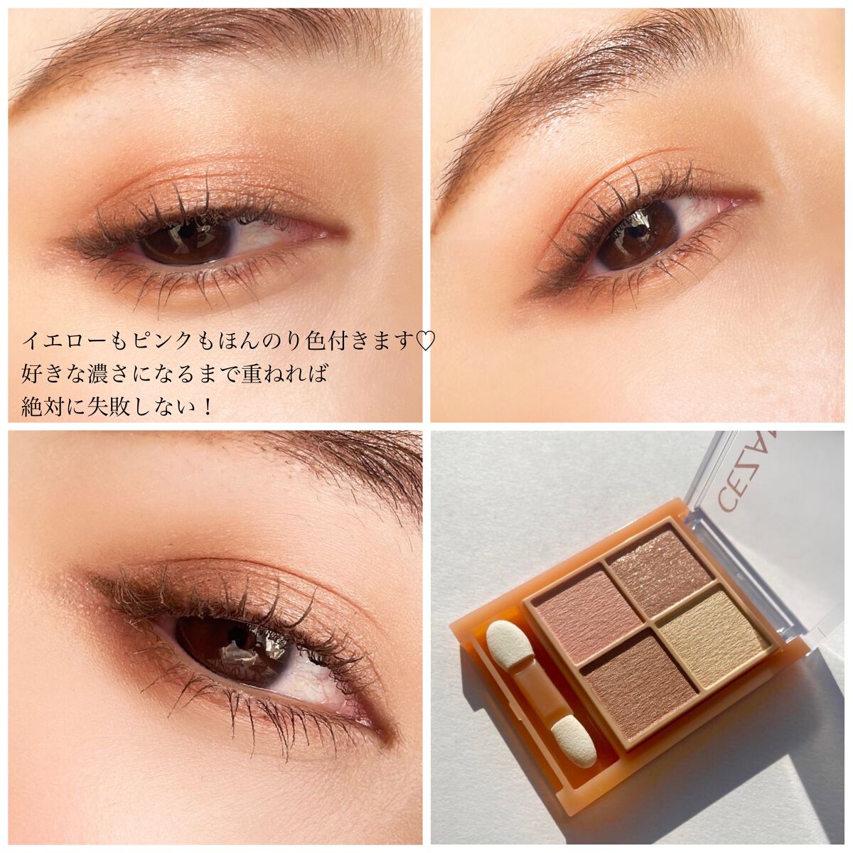 - ラメ・パール・マット3質感の4色アイシャドウ。 肌馴染みの良いベージュを基調としたカラー。ラメ・パール・マットの3質感を重ねて、自然にまぶたを強調し奥行のある大きな目元へ。 しっとり溶け込むような柔らかなパウダーなので、スルスル伸びてまぶたにピタッと密着。保湿成分(スクワラン・ホホバ種子油)配合。