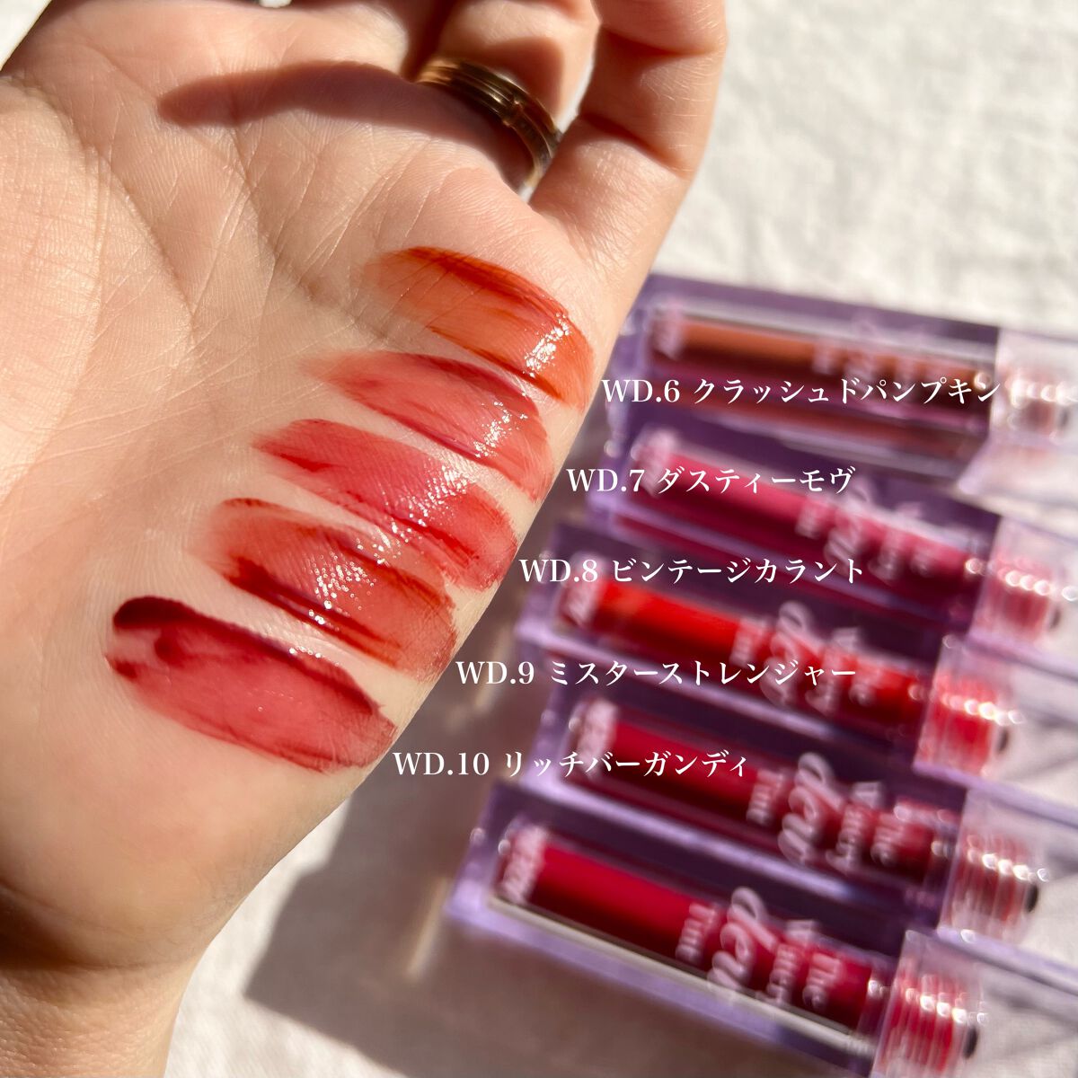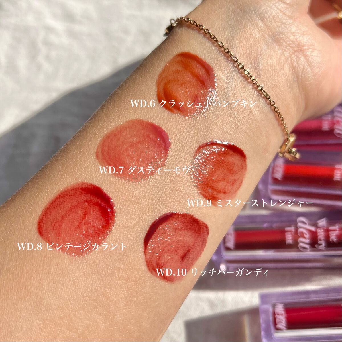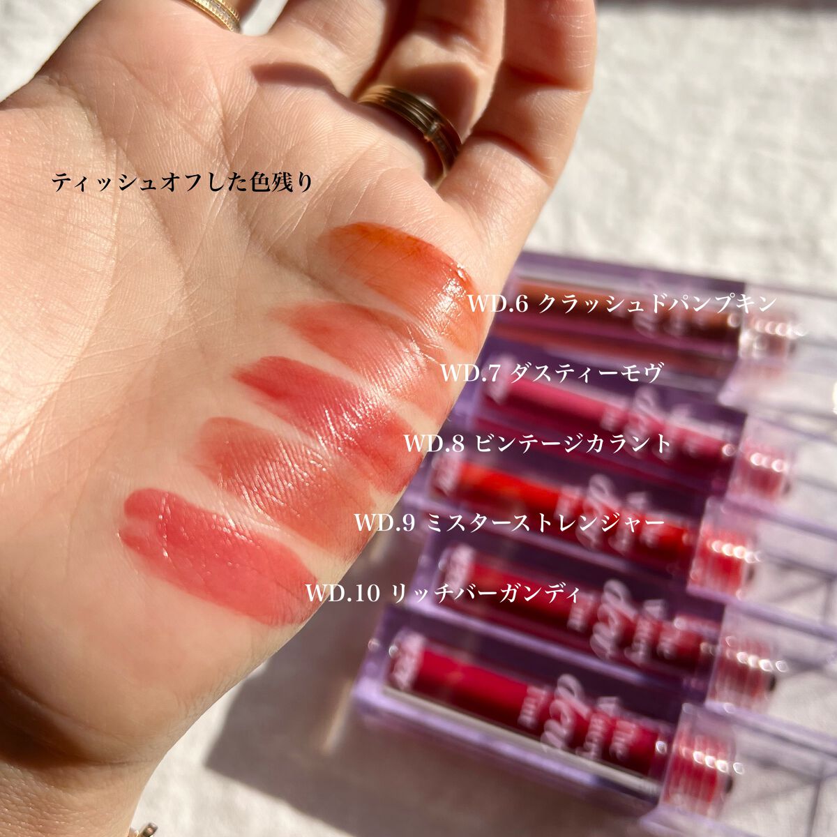 - <WD2 ビトゥン ローズ> 水、ジフェニルジメチコン、リンゴ酸ジイソステアリル、ビスジグリセリルポリアシルアジペート-2、水添ポリイソブテン、ジグリセリン、DPG、セチルPEG/PPG-10/1ジメチコン、イソステアリン酸ソルビタン、ポリソルベート60、ペンチレングリコール、オクチルドデカノール、セテアレス-20、(アクリル酸ヒドロキシエチル/アクリロイルジメチルタウリンNa)コポリマー、スクワラン、フェノキシエタノール、ポリグリセリン-3、ステビオシド、香料、エチルヘキシルグリセリン、グリセリン、シア脂、ツバキ種子油、トリ(カプリル酸/カプリン酸)グリセリル、アルガニアスピノサ核油、ホホバ種子油、アーモンド油、アンズ核油、月見草油、オリーブ果実油、テトラ(ジ-t-ブチルヒドロキシヒドロケイヒ酸)ペンタエリスリチル、カニナバラ果実エキス、マンゴー果実エキス、赤104(1)、赤227、黄5、青1 <WD3 ピンク ヘイズ> 水、ジフェニルジメチコン、リンゴ酸ジイソステアリル、ビスジグリセリルポリアシルアジペート-2、水添ポリイソブテン、ジグリセリン、DPG、セチルPEG/PPG-10/1ジメチコン、イソステアリン酸ソルビタン、ポリソルベート60、ペンチレングリコール、オクチルドデカノール、セテアレス-20、(アクリル酸ヒドロキシエチル/アクリロイルジメチルタウリンNa)コポリマー、スクワラン、フェノキシエタノール、ポリグリセリン-3、ステビオシド、香料、エチルヘキシルグリセリン、グリセリン、水酸化Al、ポリアクリル酸アンモニウム、BG、アルガニアスピノサ核油、シア脂、ツバキ種子油、トリ(カプリル酸/カプリン酸)グリセリル、アーモンド油、アンズ核油、ホホバ種子油、月見草油、オリーブ果実油、テトラ(ジ-t-ブチルヒドロキシヒドロケイヒ酸)ペンタエリスリチル、マンゴー果実エキス、カニナバラ果実エキス、酸化チタン、赤104(1)、赤227、黄5、青1 <WD4 オールウェイズ ヤング> 水、ジフェニルジメチコン、リンゴ酸ジイソステアリル、ビスジグリセリルポリアシルアジペート-2、水添ポリイソブテン、ジグリセリン、DPG、セチルPEG/PPG-10/1ジメチコン、イソステアリン酸ソルビタン、ポリソルベート60、ペンチレングリコール、オクチルドデカノール、セテアレス-20、(アクリル酸ヒドロキシエチル/アクリロイルジメチルタウリンNa)コポリマー、スクワラン、フェノキシエタノール、ポリグリセリン-3、ステビオシド、香料、エチルヘキシルグリセリン、グリセリン、シア脂、ツバキ種子油、トリ(カプリル酸/カプリン酸)グリセリル、アルガニアスピノサ核油、ホホバ種子油、アーモンド油、アンズ核油、月見草油、オリーブ果実油、テトラ(ジ-t-ブチルヒドロキシヒドロケイヒ酸)ペンタエリスリチル、カニナバラ果実エキス、マンゴー果実エキス、赤104(1)、赤227、黄5、青1 <WD6 クラッシュド パンプキン> 水、水添ポリイソブテン、リンゴ酸ジイソステアリル、ビスジグリセリルポリアシルアジペート-2、ジフェニルシロキシフェニルトリメチコン、ジフェニルジメチコン、ポリグリセリン-3、オクチルドデカノール、ポリソルベート60、セチルPEG/PPG-10/1ジメチコン、ラウリン酸ポリグリセリル-10、ペンチレングリコール、1,2-ヘキサンジオール、(アクリル酸ヒドロキシエチル/アクリロイルジメチルタウリンNa)コポリマー、PEG-60水添ヒマシ油、セテアリルアルコール、スクワラン、キシリトール、エチルヘキシルグリセリン、香料、ポリアクリル酸アンモニウム、イソステアリン酸ソルビタン、水酸化Al、フェノキシエタノール、BG、トコフェロール、酸化チタン、酸化鉄、赤227、黄4、黄5、青1 <WD8 ビンテージ カラント> 水、水添ポリイソブテン、リンゴ酸ジイソステアリル、ビスジグリセリルポリアシルアジペート-2、ジフェニルシロキシフェニルトリメチコン、ジフェニルジメチコン、オクチルドデカノール、ポリグリセリン-3、ポリソルベート60、セチルPEG/PPG-10/1ジメチコン、ラウリン酸ポリグリセリル-10、1,2-ヘキサンジオール、ペンチレングリコール、(アクリル酸ヒドロキシエチル/アクリロイルジメチルタウリンNa)コポリマー、PEG-60水添ヒマシ油、セテアリルアルコール、スクワラン、キシリトール、エチルヘキシルグリセリン、香料、イソステアリン酸ソルビタン、トコフェロール、赤104(1)、赤227、黄5、青1 <WD9 ミスター ストレンジャー> 水、水添ポリイソブテン、リンゴ酸ジイソステアリル、ビスジグリセリルポリアシルアジペート-2、ジフェニルシロキシフェニルトリメチコン、ジフェニルジメチコン、オクチルドデカノール、ポリグリセリン-3、ポリソルベート60、セチルPEG/PPG-10/1ジメチコン、ラウリン酸ポリグリセリル-10、1,2-ヘキサンジオール、ペンチレングリコール、(アクリル酸ヒドロキシエチル/アクリロイルジメチルタウリンNa)コポリマー、セテアリルアルコール、PEG-60水添ヒマシ油、スクワラン、キシリトール、エチルヘキシルグリセリン、香料、イソステアリン酸ソルビタン、水酸化Al、ポ