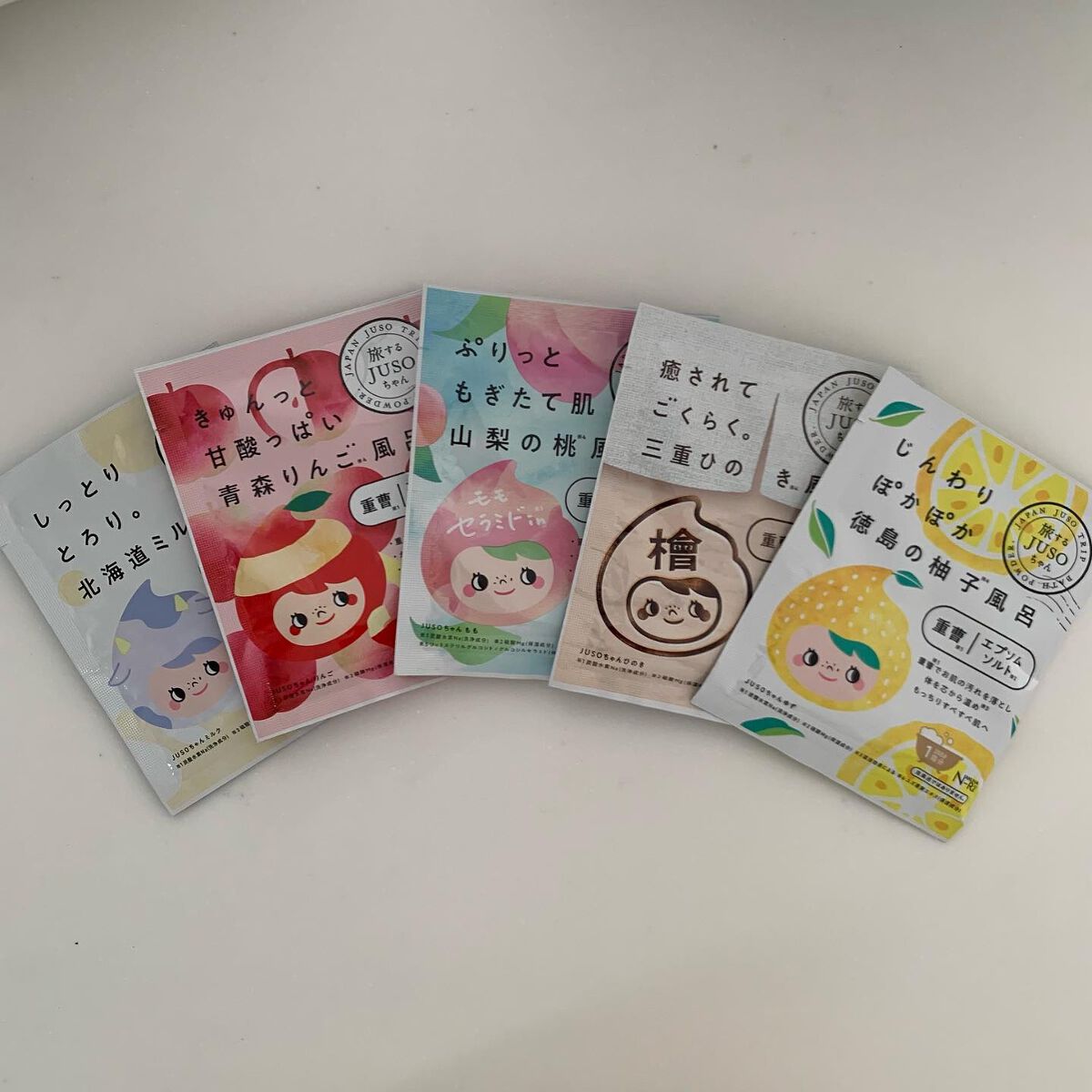 エプソムソルトに重曹、そこにJUSOちゃんが日本各地を旅して出会った素材が入ったバスパウダー♡ 青森のりんごは〜りんごの香り〜 これが一番好き♡ 薄い透明赤色のお湯で、ゆっくり入ってるとウトウト眠くなるくらいリラックスできましたー 愛媛温州みかんは〜みかんの香り〜 入れたばかりの時は濃いめの色かと思ったけど全体に混ざったら薄橙色というか乳白オレンジ色!