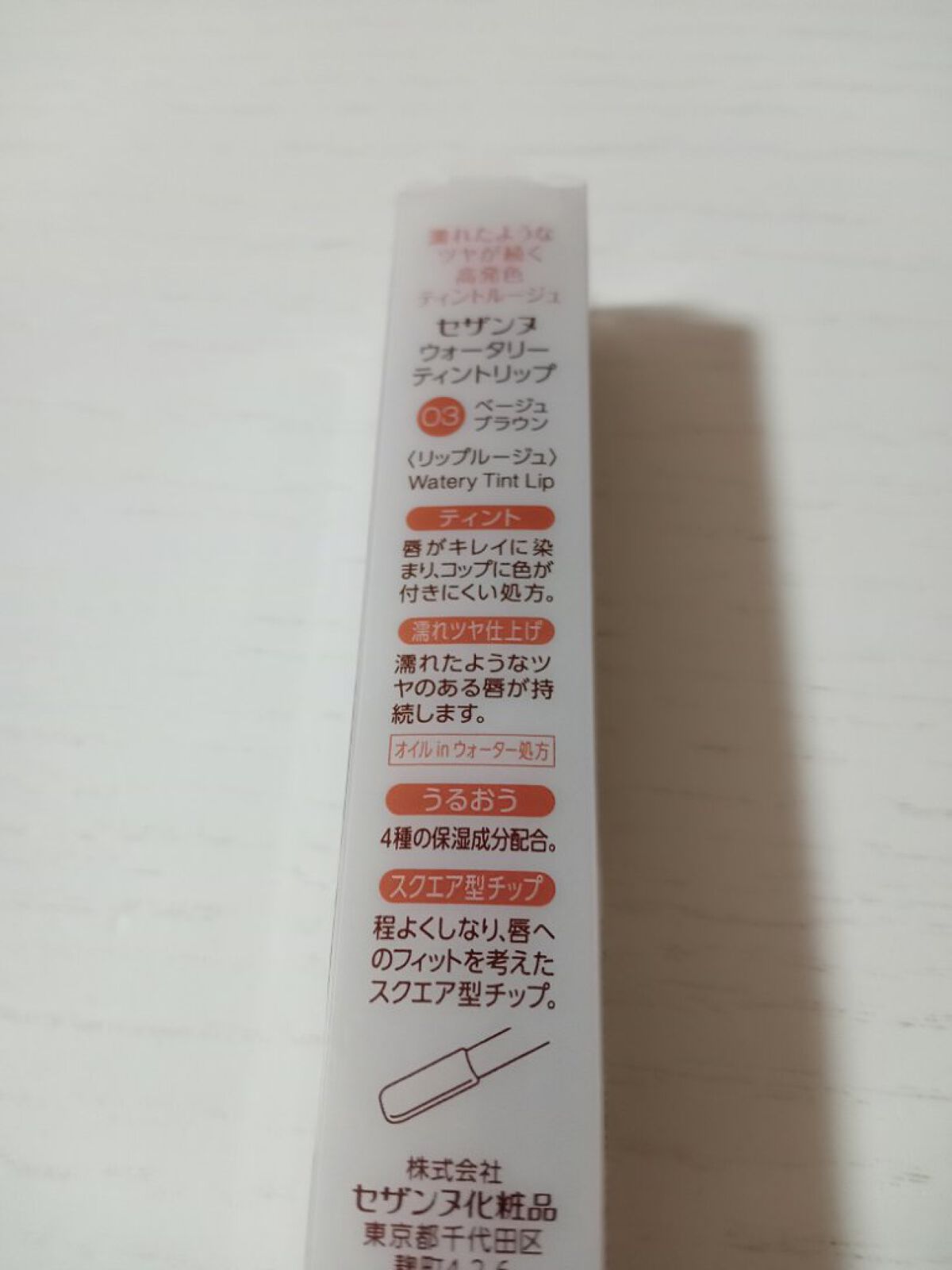 - ツヤ×色×潤いをキープする、セザンヌの新濡れツヤリップ みずみずしい濡れツヤ感ある仕上がりで、発色とツヤが長続きするティントリップです。ティントの発色を透明のベールで覆うリップコートのような処方で、ツヤ感と色をキープします。さらに、唇表面のべたつきは少なく、しっとり潤うオイルinウォーター処方を採用しています。