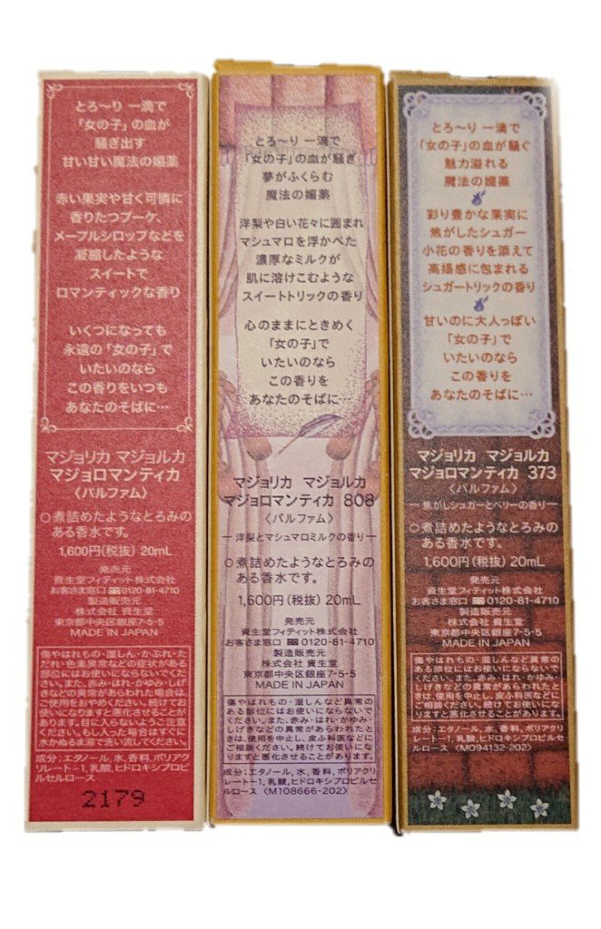 スパチュラタイプの香水! とろみのあるテクスチャー! どれも濃厚な香り♥️ マジョロマンティカ 甘い香水の香り! 3つの中で1番香水っぽい香り! フルーティーな香りから、 だんだんとバニラのような甘い香りに! 大人なセクシーさを感じる甘さの香り♥️ マジョロマンティカ373 焦がしシュガーとベリーの香り! 3つの中で1番グルマンな香り! ベリーやキャンディーのような甘い香り! かすかに苦味を感じる! この苦味の香りは全く前面に出てこないので、 甘さ全開な香り! キュートな甘さの香り♥️ マジョロマンティカ808 洋梨とマシュマロミルクの香り! 少しパウダリーな石鹸ぽさのある香り! 初めは爽やかかなぁと思ったけど、 だんだんと甘さが増してくる! 体調によっては酔ってしまいそうな香り! フェミニンな女性らしい香り♥️