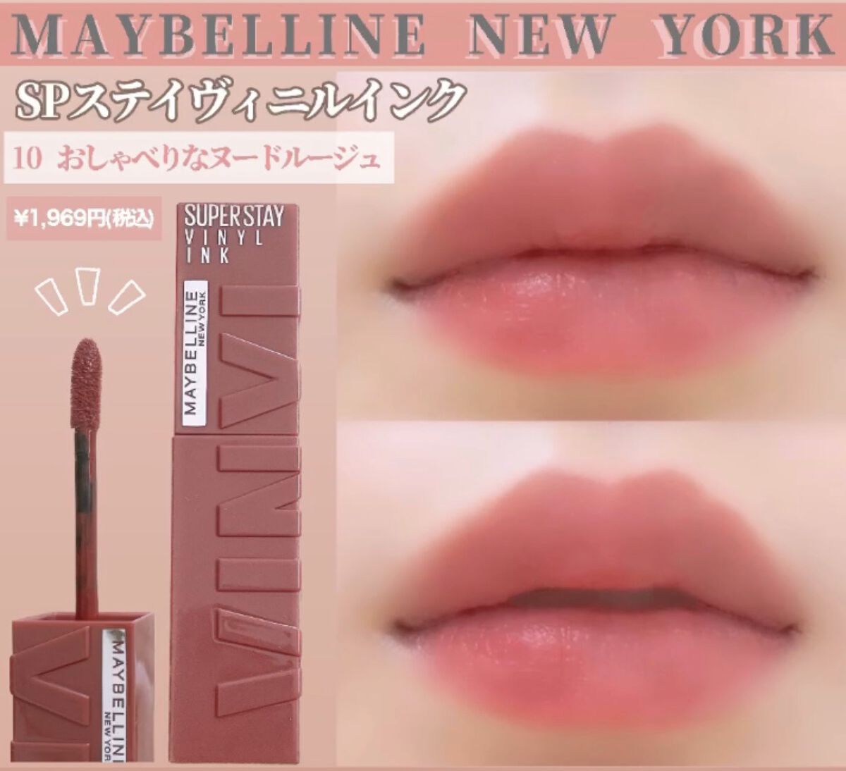 MAYBELLINENEWYORKSPステイヴィニルインク10おしゃべりなヌードルージュ色もツヤも落ちないリップです。鮮やかな発色と濃密なツヤを、シャカシャカ振ってひと塗りで唇を包み込み、うるおい感ある仕上がりに。#MAYBELLINENEW...