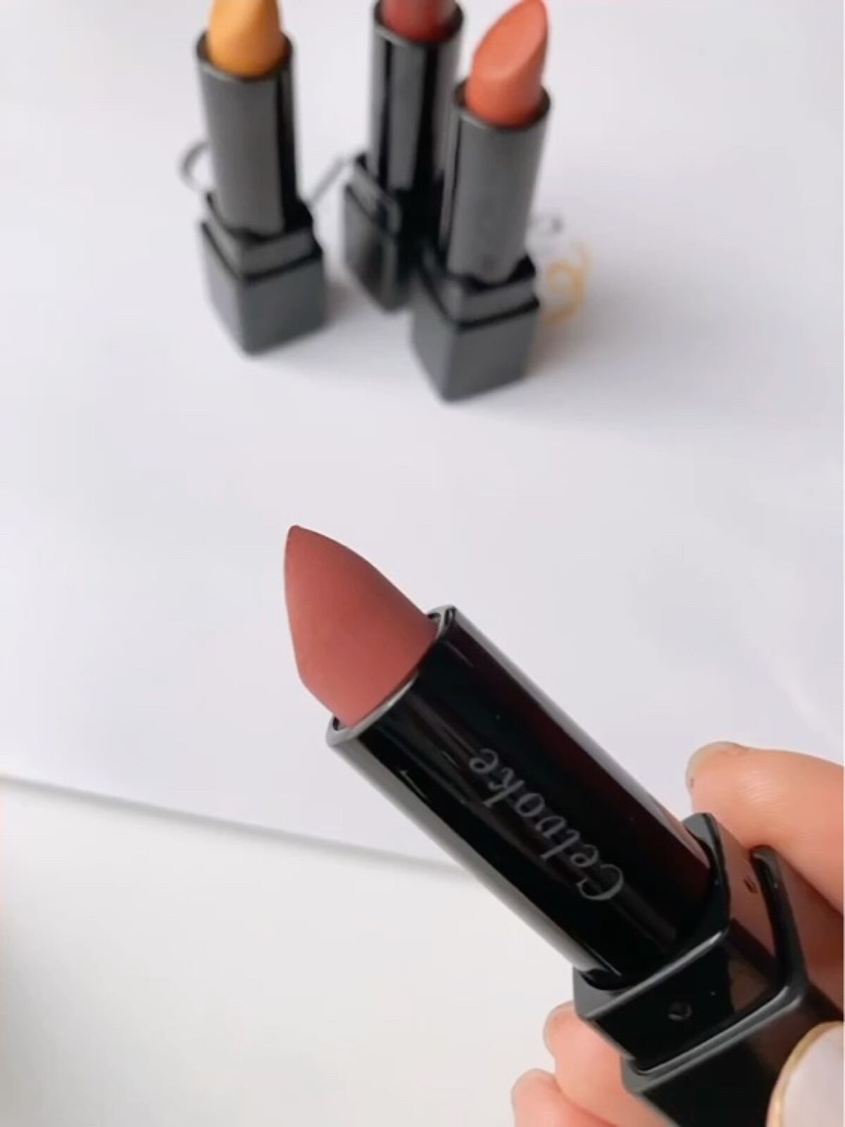 質感はセミツヤ?生っぽい?? とにかくワザとらしくない、自然に唇が潤ってるようなツヤ感でトレンドや季節関係なく、ずっと使える質感。 04ピンクブラウン🦩 オレンジや黄味が苦手な人こそモノに出来るブラウンリップ。深みがありつつ、優しいまろやかな表情にしてくれます。 09 テラコッタ🏜 celvokeといえばこの色!とにかくオレンジとくすみ感のバランスが絶妙。赤みもしっかり入っているので、黄味が苦手な人でもPCを超えて付けこなせるカラー。 10 レンガ🧱 ブラウンとボルドーの間のような、こっくり深みのあるカラー。色自体に重厚感はあれど、ディグニファイドが透け感を出しやすくツヤっぽいおかげで重い印象にはならない。 29 キャメル🐫 テラコッタの次にcelvokeらしい色が、こんな“くすみイエロー”。何ゆえこんな変わった色を?と言うと、黄味で唇の赤みを中和&くすみで日本人の肌に馴染ませる事で、結果ベージュっぽいこなれた唇にするのが目的なんだそう👀