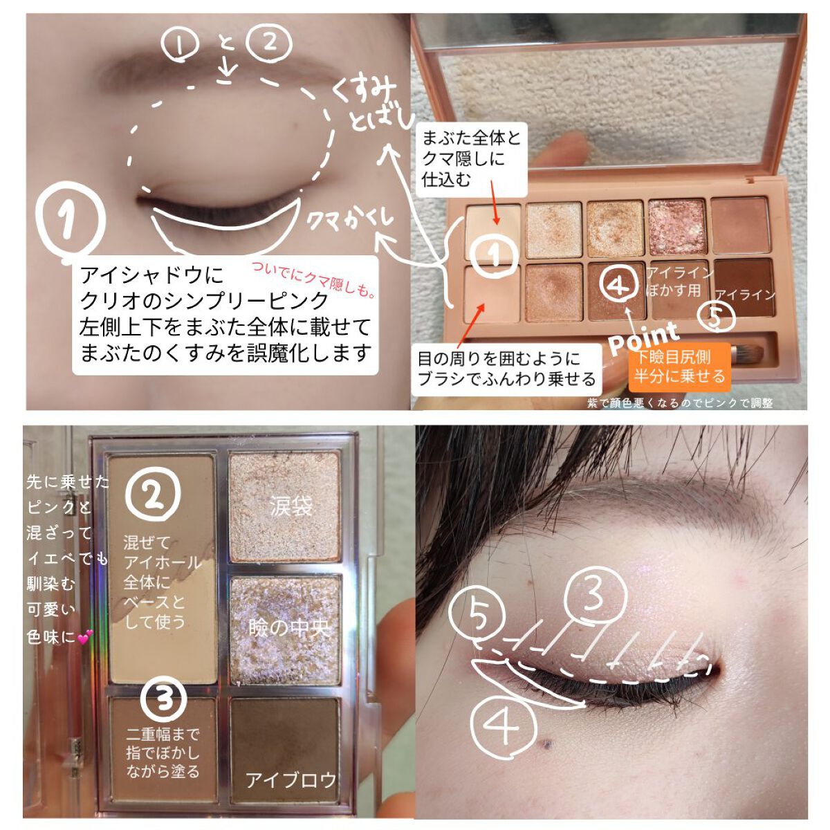 一番濃い紫の締色は、目周りに使用すると、すんごく顔色悪くなってしまうため、アイブロウとして使用。 ラメも2種類あって、瞼と涙袋に乗せるとキラキラしててすんごく可愛いです。 ブラシより指で塗ったほうが思った色味に調整しやすく、おすすめです。 私のお気に入りコスメ、プロアイパレットの01シンプリーピンクを下瞼に使用することで、私的には更に馴染みが良くなります。 瞼にもシンプリーピンクの白+ピンクを仕込んでますが、少しでも赤みっぽいカラーが瞼にニュアンスとして入ることで、青紫系の苦手な方でも、赤紫っぽく発色して使いやすくなるのかな?と思います。