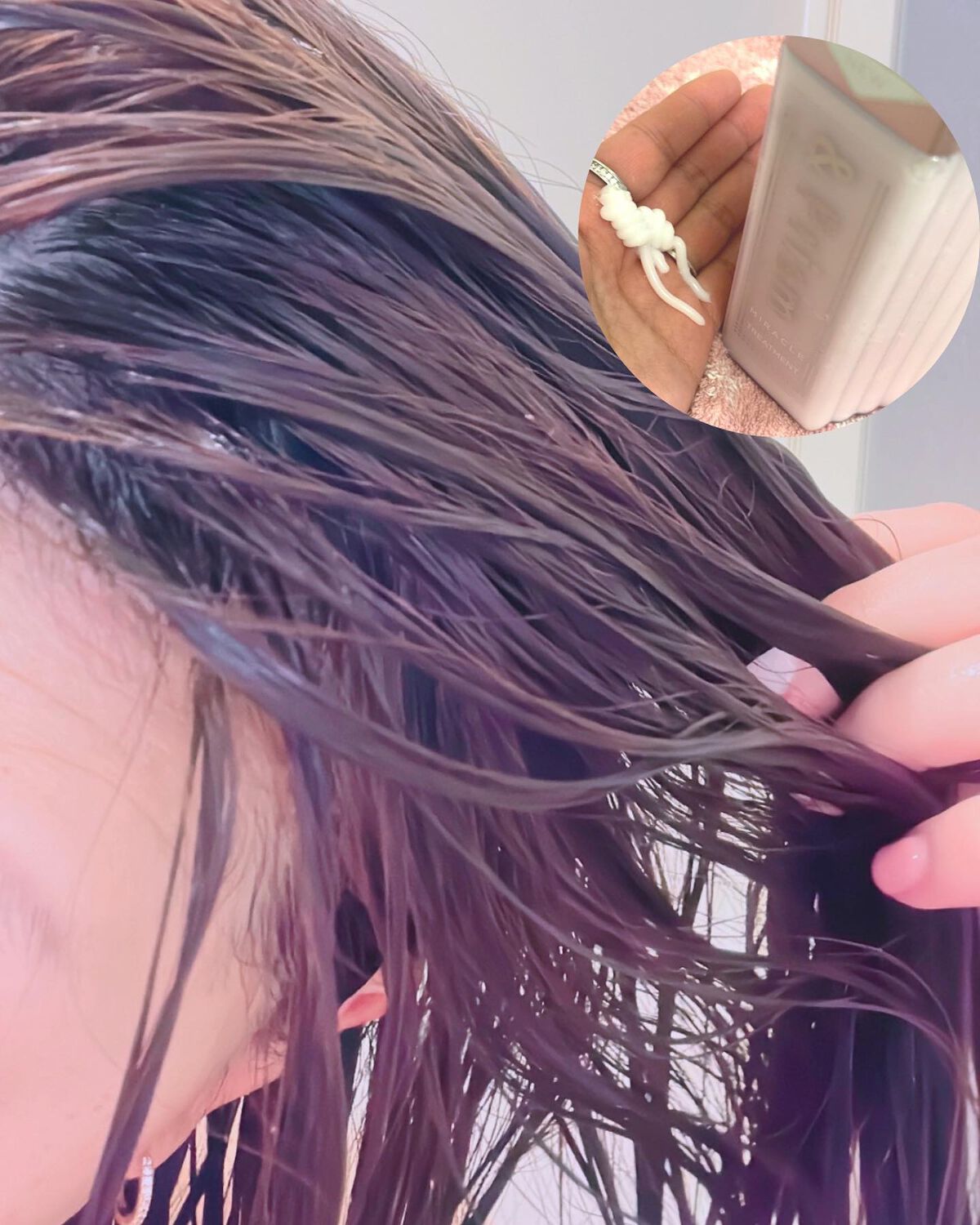 カラーシャンプーは青色で、水を含ませてよく泡立ててて髪を洗ってくよ! トリートメントも色は紫っぽいブルーでこちらも揉み込みながら馴染ませていくと色の入りがいいかも。 トリートメントも、こっくりな感じだけど 馴染みやすく洗い上がりはつるんって感じ