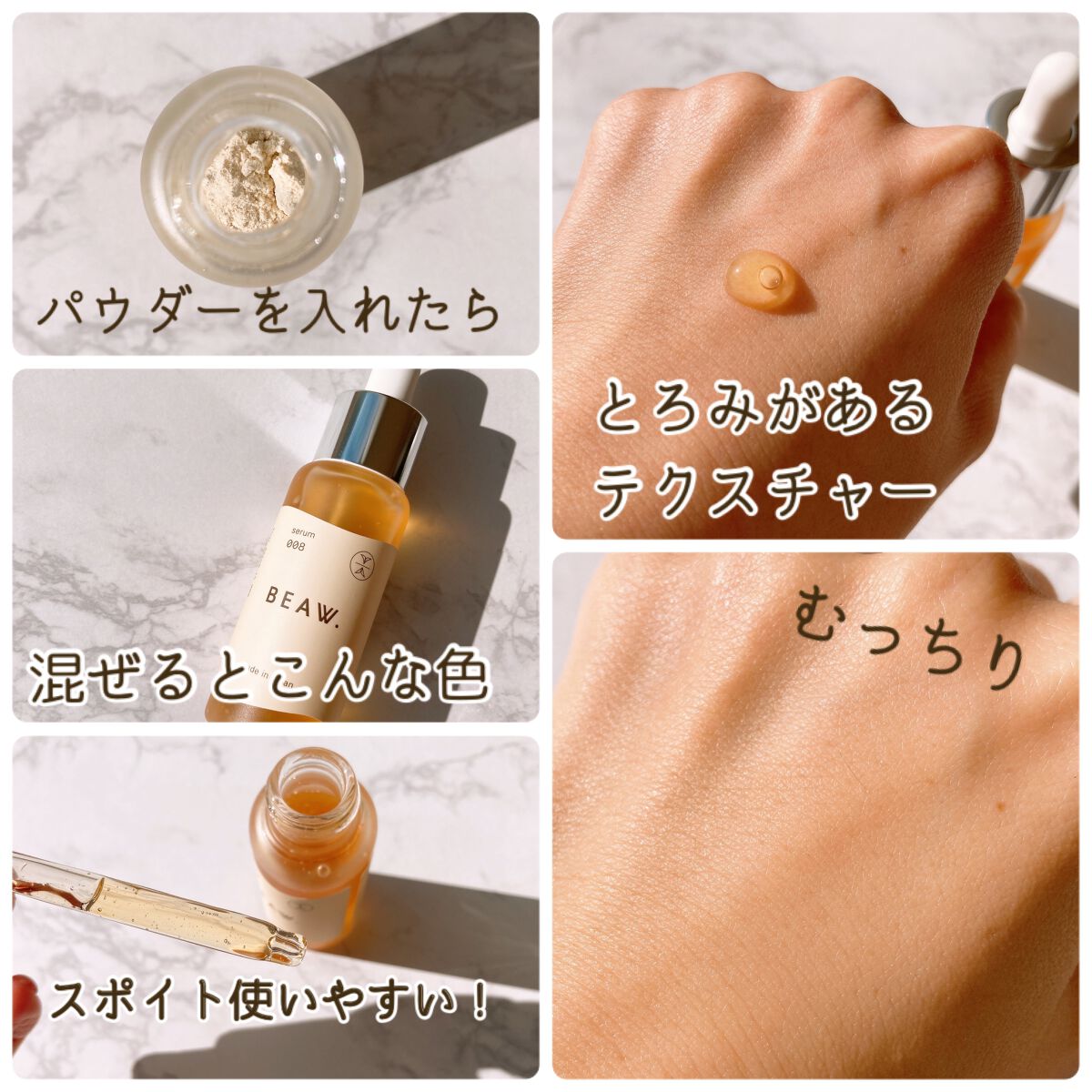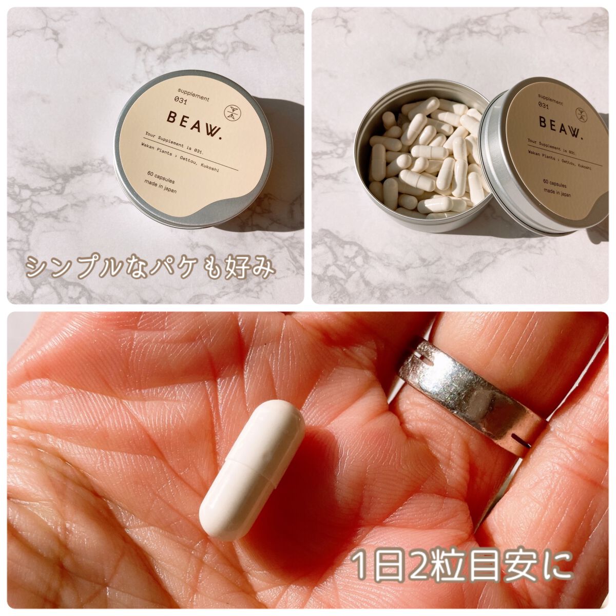- ・BEAW.のパーソナライズケアは始めにパーソナライズ診断を行い、20種類の和漢と、自然由来の保湿成分の組み合わせから、一人ひとりに合わせた製品をお届けします。 ・現在の自分の悩みにぴったりのパーソナルケアキット、和漢植物由来成分を配合した2剤式のセラムとサプリメントのセットでお届けします。からだの内と外から同時に理想の美しさをめざせるデュアルケアで、あなたの美容をサポートします。 ・美容液は、肌荒れ予防、乾燥、毛穴、テカリ、くすみ*、年齢肌、ツヤ肌、などその人それぞれの悩みに対して適した処方で国産和漢植物成分と、植物エキス、ビタミンやセラミド、プラセンタ、ナイアシンアミド、などを配合した保湿成分を分析結果に合わせて配合。*乾燥による ・サプリメントは体の内側からキレイをサポートする国産和漢植物成分と20種類以上のビタミン、ミネラルをそれぞれに合わせて配合。 -対象商品- BEAW.リッチセラム003、008、015 BEAW.サプリメント:001、007、031 BEAW.フェイスウォッシュ:019、026、045 -内容量- BEAW.リッチセラム:30ml BEAW.サプリメント:60粒 BEAW.フェイスウォッシュ:80g