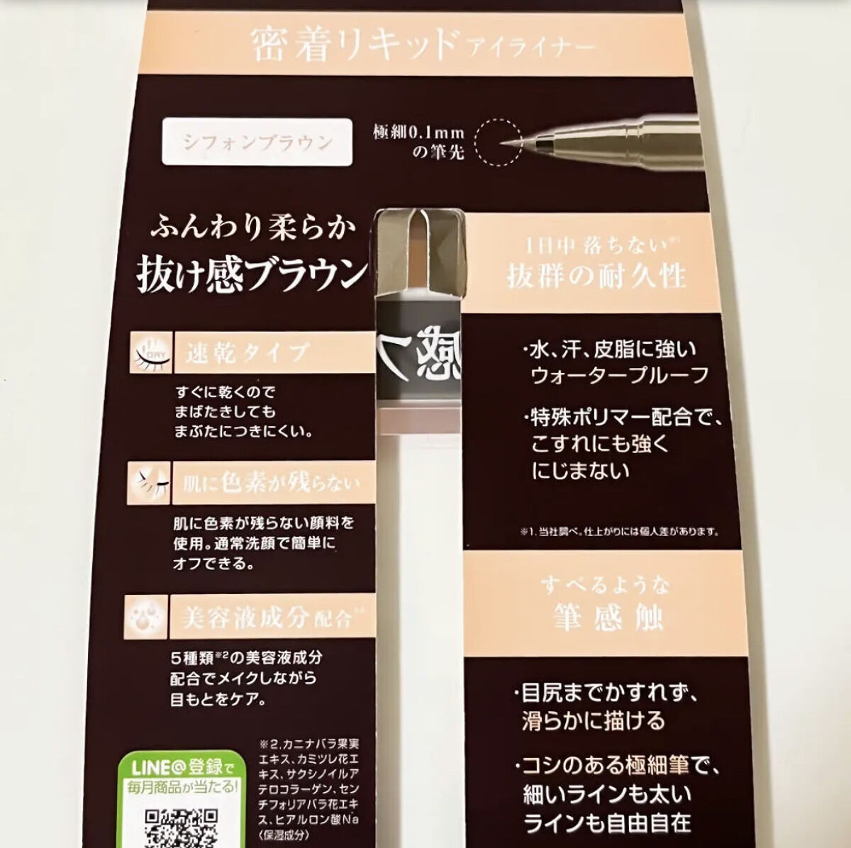 - 筆先までずっとなめらか、目尻で感動するリキッドアイライナー。 必要な量が肌にのる新設計で、まぶたの上をすべるような、滑らかな描き心地。しなやかでコシのある筆が、筆圧のコントロールを容易にし、太いラインも細いラインも思い通りに仕上げます。水、汗、涙に強いウォータープルーフタイプなのに、通常洗顔で簡単オフ。肌に色素が残らない顔料を使用。5種類の美容液成分を従来品の200%配合し、メイクしながら目元ケアまで。 ●ブラウンブラック ※2020年9月12日 バラエティショップ先行発売 ●漆黒ブラック ※2020年12月頃発売予定 ●ナチュラルブラウン ※2020年12月頃発売予定 ●シフォンブラウン 「毎日メイクに透明感と抜け感」 ブラウンでも、グレーでも、ベージュでもないニュアンスカラー。 自然な印影で素の目元を際立て、頑張りすぎない、ふんわりとした目元に。 ●アプリコットブラウン 「じゅわっと血色感。 肌に馴染むおしゃれカラー」 温かみのあるアプリコットがじゅわっと滲む血色感を目元に演出。 肌馴染みが良いので、カラーライナーに抵抗がある方もブラウンの延長線上で楽しめる、使いやすい色味です。 ”ちょっとオシャレ”な空気感を演出するカラー。 ●ピンクショコラ アイライナー 「ピンクが溶け込む濃厚ブラウン」 肌馴染みが良く、目元にじんわり血色感をプラス。 さりげなく女性らしさが加速するようなカラー。 ●ピスタチオラテ (2022年7月29日(金)発売) 「“目尻”に抜け感アクセント」 肌に馴染むのに映える絶妙なグリーン。 トレンドカラーに“くすみ”と“抜け感”をプラスしたまろやかな発色。 ●マスタードブラウン 「“イエロー”が揺れる、大人の洒落色」 (2022年7月29日(金)発売) まるで太陽のような暖かさを感じる新しいブラウン。 ほんのり感じるイエローでメイクが一気に垢抜ける稀有な色。 ●シフォンピンク(2023年2月10日発売) 「ふんわり柔らか"まろみピンク"」 甘くなりすぎない青みニュアンスで目元の透明感UP。 目元を引き締め、ピンクメイクにありがちな腫れぼったさを解消。 ●ミルクカプチーノ(2023年4月21日発売) まろやかな深みの“優しい締め色” どんなメイクにも合わせやすいカラー。 自然な陰影でさりげなく目幅を拡張します。 ●グレーカシミア(2023年10月1日発売) ブラウンがほんのり溶け込んだ、暖色グレー まろやかな発色で、パーソナルカラーを問わず肌に馴染む 目元の陰影になりすまし、抜け感と目力を欲張りに叶える ●ダークフィグ(2024年6月1日発売) するする”なめらか。描きやすいのに、落ちにくい。 クッキリ可愛いほの甘ダークブラウン ●ピーチモカ(2024年8月1日発売) ふわっと自然に盛れる“桃色ブラウン” ほんのり血色感で目元にうるみ感を演出 ●スターダストブラウン(2024年12月11日発売) キラッと繊細に輝く''星屑ブラウン'' 透け感のあるダークブラウンの色味とラメの輝きが、目元に艶のある立体感を演出 ●チャコールモカ(2025年4月10日発売) 目元を締める''深みグレージュ'' 黄みや赤みに偏りすぎない絶妙な色設計で、自然に目元を強調