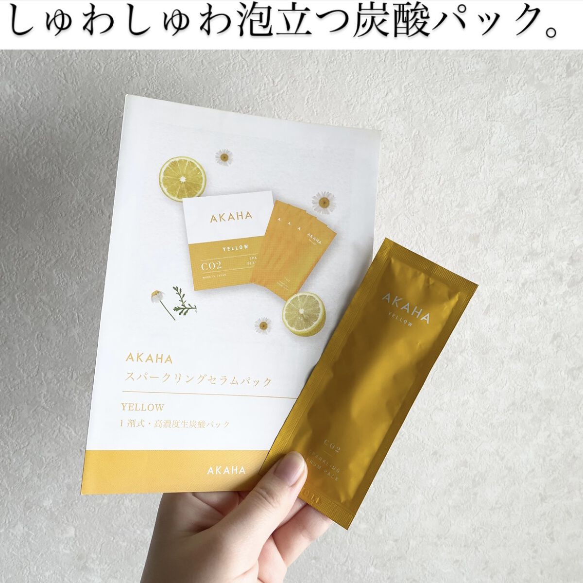黄色の炭酸パックを使ってみました🕊 天然成分で色付けされたYELLOWジェルは40種類の美容成分配合🤍 混ぜる作業がない1包使い切りタイプです✨ 手軽さが魅力💖 肌にのばして少しするとモクモク発泡☁️ AKAHAの炭酸パックはゆっくり発泡してくれるため焦らなくていい☝️ 垂れにくいこってりテクスチャーも塗りやすいです✨ 炭酸ガス発生量 20,000PPMと超高濃度炭酸❕ 私はピリピリ刺激を感じずに使用できました🤍