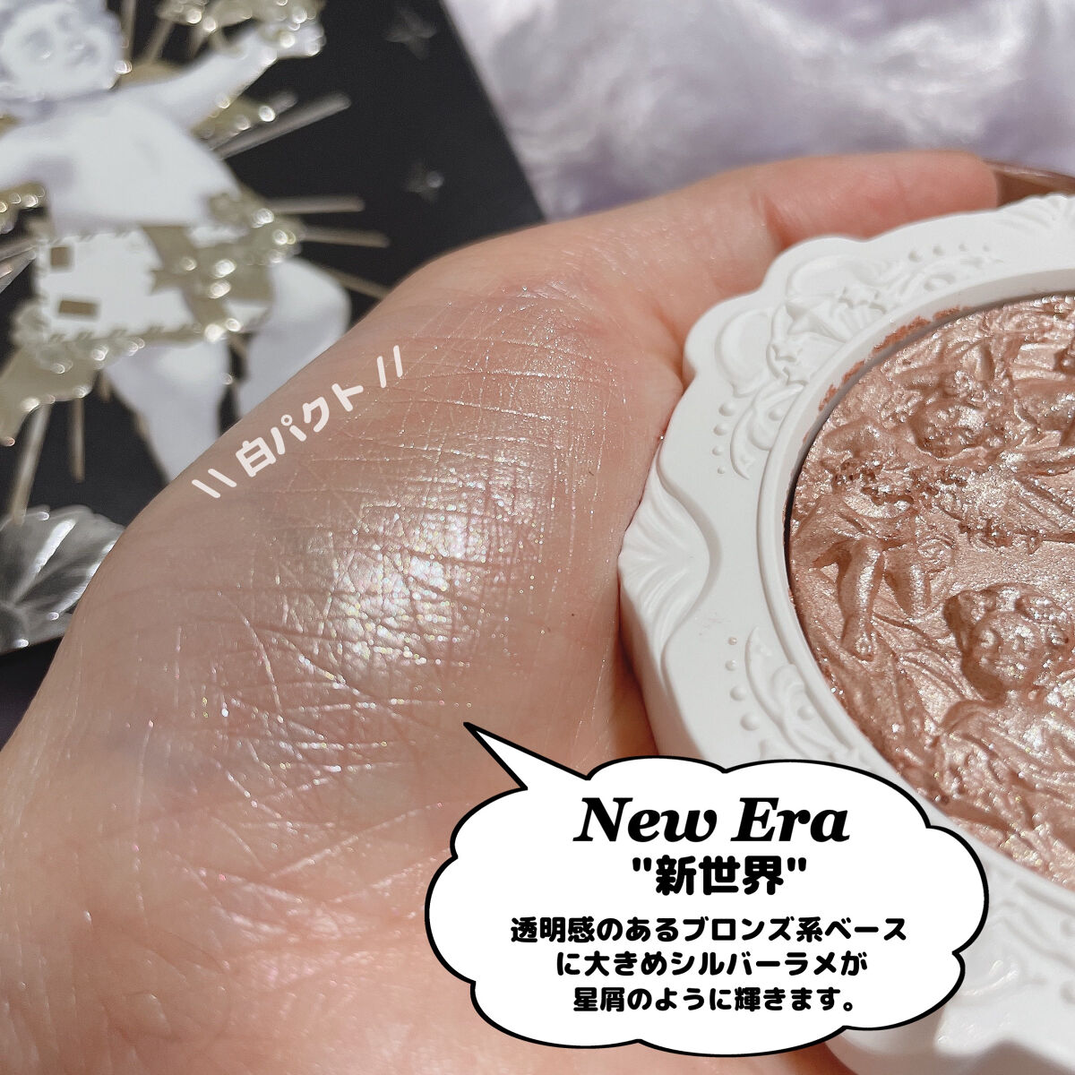 シャンパンピンクをベースにしたハイライター。パッケージデザインはステンドグラスの前で祈る天使を描いた美しいコンパクトで、中のパウダーにも西洋神話をモチーフにした繊細な彫刻が施されている。 まず見た目が可愛すぎる😍ギラギラしすぎなくてすごく使いやすいし、肌なじみのいい色味で変な光り方しないからハイライター初心者(私)にぴったりかも😳 なにより使っててテンション上がるところが高ポイント💡オススメです🙌
