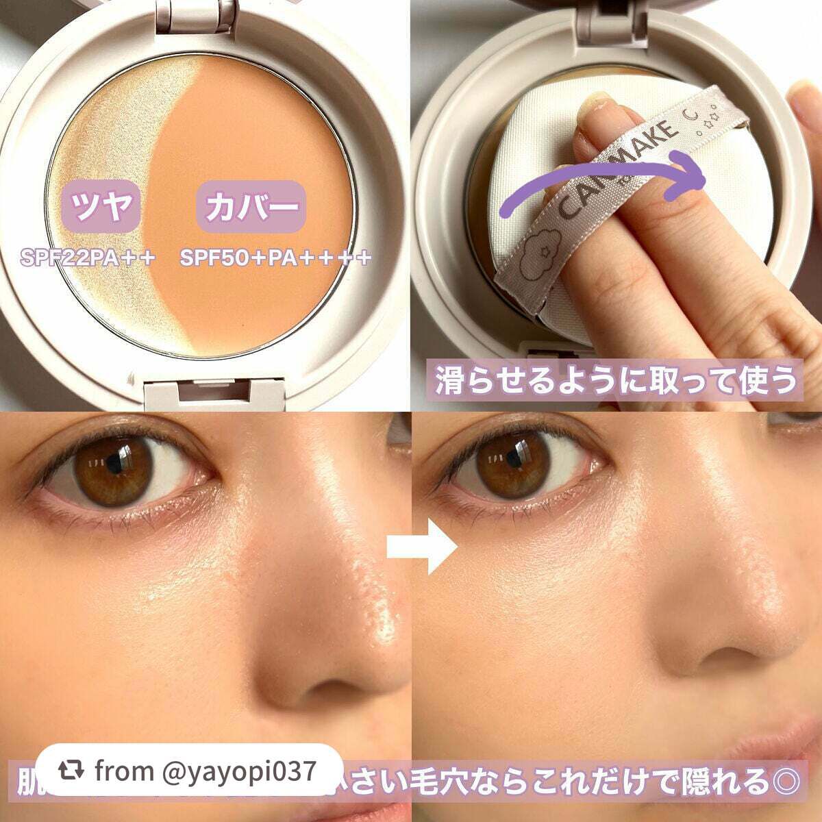 - ツヤとカバーの2種のベースが1つになった 2in1ツヤ肌パクト 繊細な白パールをたっぷり配合した上品なジューシーグロウクリームと パール無配合で肌悩みを自然にカバーするナチュラルカバーファンデーションの、2in1構造! ツヤを好きなだけ自由にのせて、自分好みのツヤ肌を叶えてください♡ 美容オイル配合で、まるでスキンケアしたてのようなちゅるちゅるお肌が続きます。