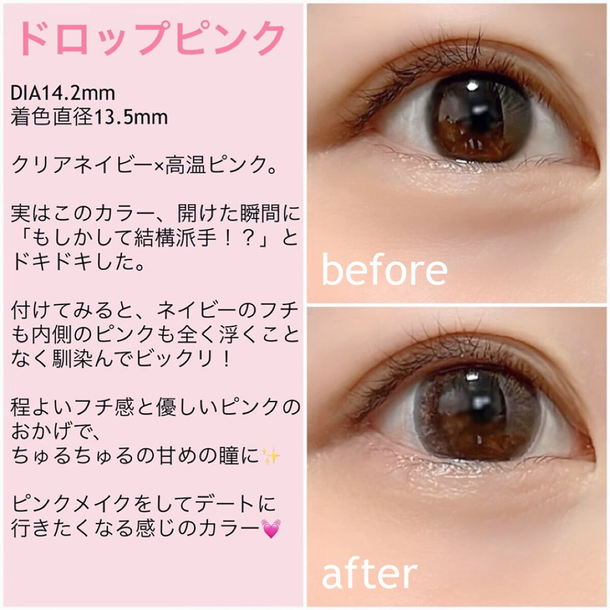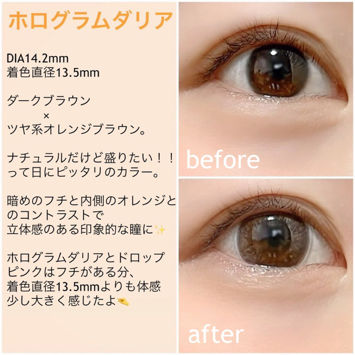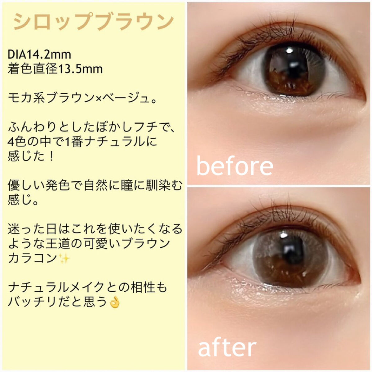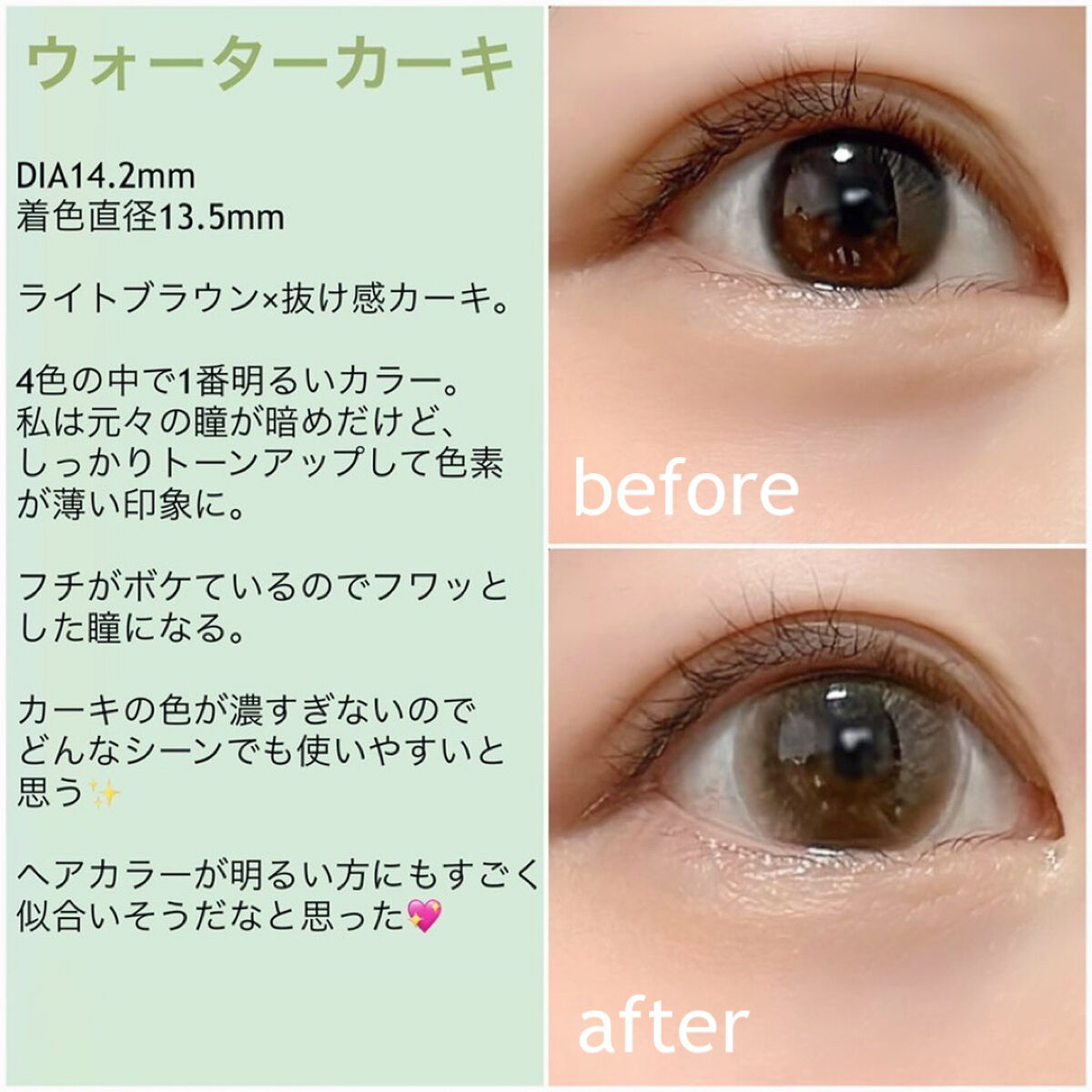 ブルーライト&紫外線をWカット出来るカラコンです❣️ ナチュラルに瞳をトーンアップしてくれて、とても使いやすいです✨ 外で光が当たると色素薄めの瞳に見えてとても可愛いです☀️ フチがボケているので、着色直径13.5mmよりは少し小さく感じました。 また、ボカしのおかげで近くで見てもわりと自然な印象です❗️ とっても可愛いくて使いやすいカラコンだと思うので、ナチュラル派さんは是非チェックしてみて下さい☺️💖