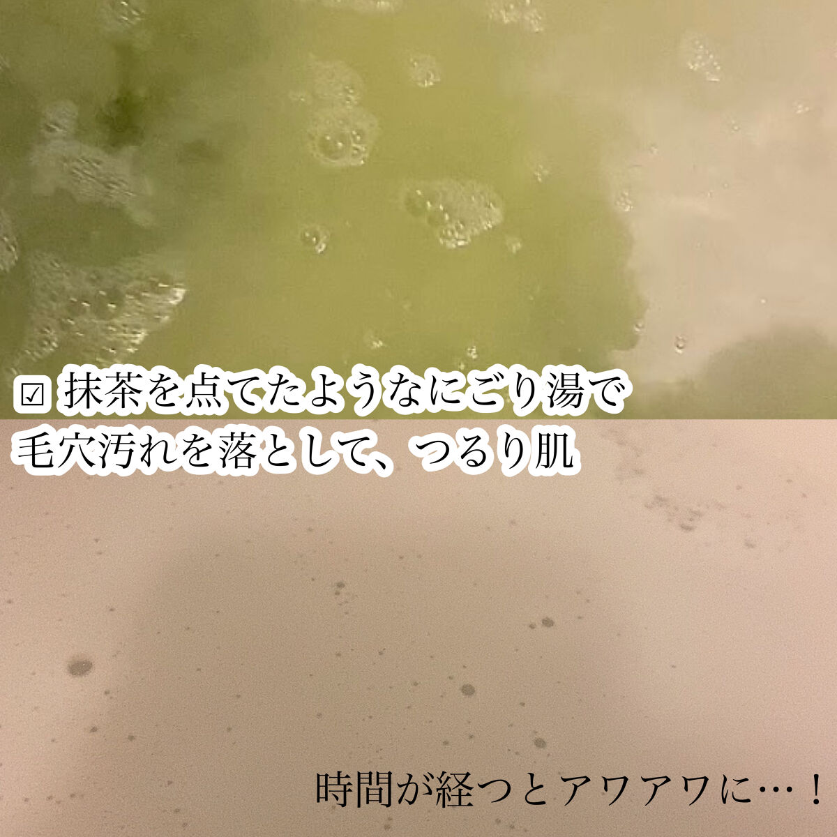 - 毛穴汚れもすっきり湯上りつるり肌! こだわりの宇治抹茶※1配合、粉末タイプの入浴料。 約400年の歴史を持つお茶屋、京都利休園厳選の宇治抹茶※1を使用。 気になる皮脂・角質などの毛穴汚れを落として、キメ細かなつるり肌に! ※1 チャ葉(保湿成分)