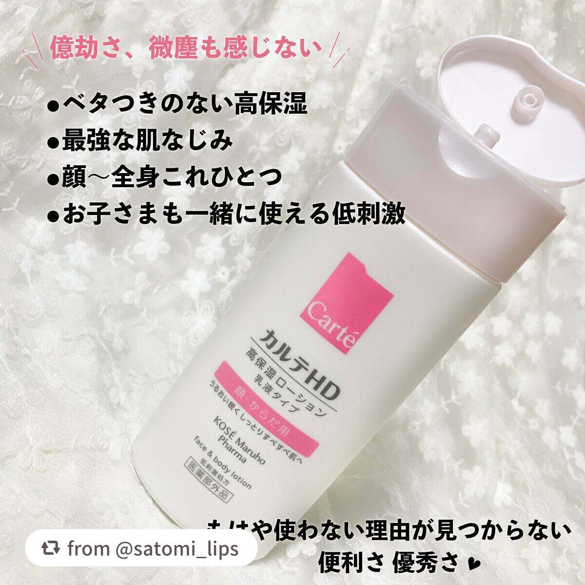- 【高保湿フェイス&ボディローション】 顔にもからだにも。しっとりやわらか肌つづく。 信頼の保水有効成分「ヘパリン類似物質HD※」配合、低刺激処方の高機能フェイス&ボディローションです。 ヘパリン類似物質HDが、気温・湿度の変化で乾燥しやすいからだの肌のうるおい構造(角層ラメラ)を立て直し、しっとりやわらか肌に導きます。 2種のこだわりオイル配合で、しっとりするのにべたつかず、なめらかにのびひろがる使用感。敏感な肌でもまさつによるストレスがなく、全身をうるおいで満たします。 カルテHDシリーズとしては初めてお子さま(3歳以上)にもお使いいただける商品。 ・ボトルタイプ(220mL) ・ポンプタイプ(410mL) ・つめかえ用(370mL)の3種でラインアップ。 ご自身の保湿に、ご家族や大切なかたの保湿に。みずみずしくなめらかなうるおいが全身を包み込むフェイス&ボディローションです。 ※保水有効成分ヘパリン類似物質のこと <販売名:HD フェイスボディL>