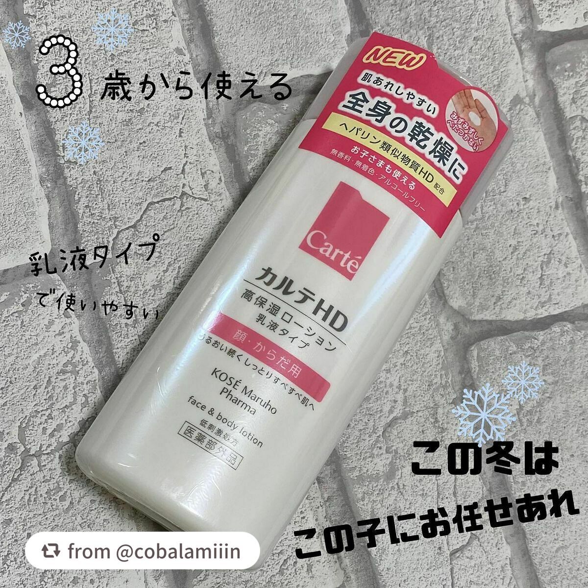 - 【高保湿フェイス&ボディローション】 顔にもからだにも。しっとりやわらか肌つづく。 信頼の保水有効成分「ヘパリン類似物質HD※」配合、低刺激処方の高機能フェイス&ボディローションです。 ヘパリン類似物質HDが、気温・湿度の変化で乾燥しやすいからだの肌のうるおい構造(角層ラメラ)を立て直し、しっとりやわらか肌に導きます。 2種のこだわりオイル配合で、しっとりするのにべたつかず、なめらかにのびひろがる使用感。敏感な肌でもまさつによるストレスがなく、全身をうるおいで満たします。 カルテHDシリーズとしては初めてお子さま(3歳以上)にもお使いいただける商品。 ・ボトルタイプ(220mL) ・ポンプタイプ(410mL) ・つめかえ用(370mL)の3種でラインアップ。 ご自身の保湿に、ご家族や大切なかたの保湿に。みずみずしくなめらかなうるおいが全身を包み込むフェイス&ボディローションです。 ※保水有効成分ヘパリン類似物質のこと <販売名:HD フェイスボディL>