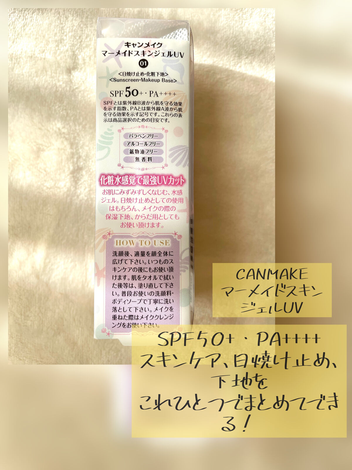 - パシャッと爽快!人魚姫気分♥化粧水感覚で使えるUVジェル 国内最強レベルのUVカット効果で紫外線から肌を守ります。 肌にのばすとパシャッとはじける水感ジェルでみずみずしく軽い仕上がり。 顔だけでなく全身にも使えます。 洗顔後、これ1本でスキンケア・保湿下地・UVカット下地としてご使用いただけます。 ※2~3時間ごとにこまめに塗り直しをしてください。 また、肌をタオル等で拭いた際も塗り直しを推奨いたします。