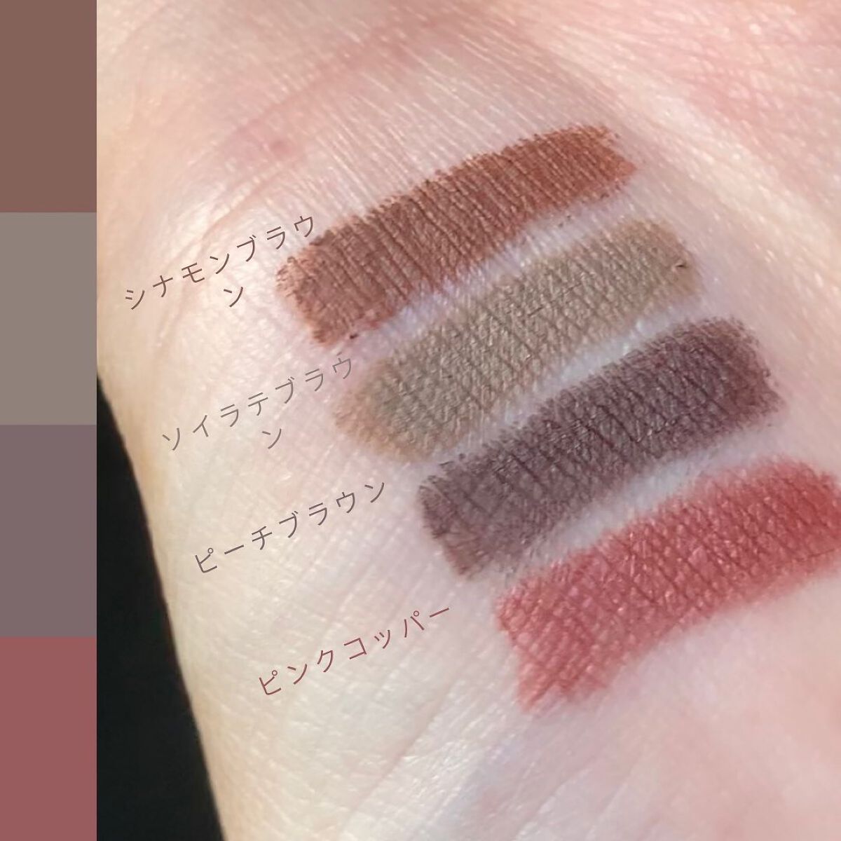 - <シナモンブラウン> ジメチコン、トリメチルシロキシケイ酸、ポリエチレン、シリカ、キャンデリラロウ、ミツロウ、(アクリレーツ/アクリル酸ステアリル/メタクリル酸ジメチコン)コポリマー、セスキイソステアリン酸ソルビタン、ジフェニルシロキシフェニルトリメチコン、トコフェノール、スクワラン、水、BG、ハイビスカス花エキス、ヒアルロン酸Na、ローズマリー葉エキス、カミツレ花エキス、水溶性コラーゲン、酸化鉄、酸化チタン、水酸化AI <ピーチブラウン> ジメチコン、トリメチルシロキシケイ酸、ポリエチレン、シリカ、キャンデリラロウ、ミツロウ、(アクリレーツ/アクリル酸ステアリル/メタクリル酸ジメチコン)コポリマー、セスキイソステアリン酸ソルビタン、ジフェニルシロキシフェニルトリメチコン、トコフェノール、スクワラン、水、BG、ハイビスカス花エキス、ヒアルロン酸Na、ローズマリー葉エキス、カミツレ花エキス、水溶性コラーゲン、酸化鉄、酸化チタン、水酸化AI <ソイラテブラウン> ジメチコン、トリメチルシロキシケイ酸、ポリエチレン、シリカ、キャンデリラロウ、ミツロウ、(アクリレーツ/アクリル酸ステアリル/メタクリル酸ジメチコン)コポリマー、セスキイソステアリン酸ソルビタン、ジフェニルシロキシフェニルトリメチコン、トコフェロール、スクワラン、水、BG、ハイビスカス花エキス、ヒアルロン酸Na、フェノキシエタノール、ローズマリー葉エキス、カミツレ花エキス、水溶性コラーゲン、クエン酸、メチルパラベン、クエン酸Na、酸化鉄、酸化チタン、水酸化AI <ピンクコッパー> ジメチコン、トリメチルシロキシケイ酸、ポリエチレン、ミツロウ、(アクリレーツ/アクリル酸ステアリル/メタクリル酸ジメチコン)コポリマー、キャンデリラロウ、セスキイソステアリン酸ソルビタン、シリカ、ジフェニルシロキシフェニルトリメチコン、脂肪酸(C18-36)グリコール、トコフェロール、スクワラン、水、BG、ハイビスカス花エキス、ヒアルロン酸Na、フェノキシエタノール、ローズマリー葉エキス、カミツレ花エキス、水溶性コラーゲン、クエン酸、メチルパラベン、クエン酸Na、酸化鉄、マイカ、酸化チタン、水酸化AI、赤226