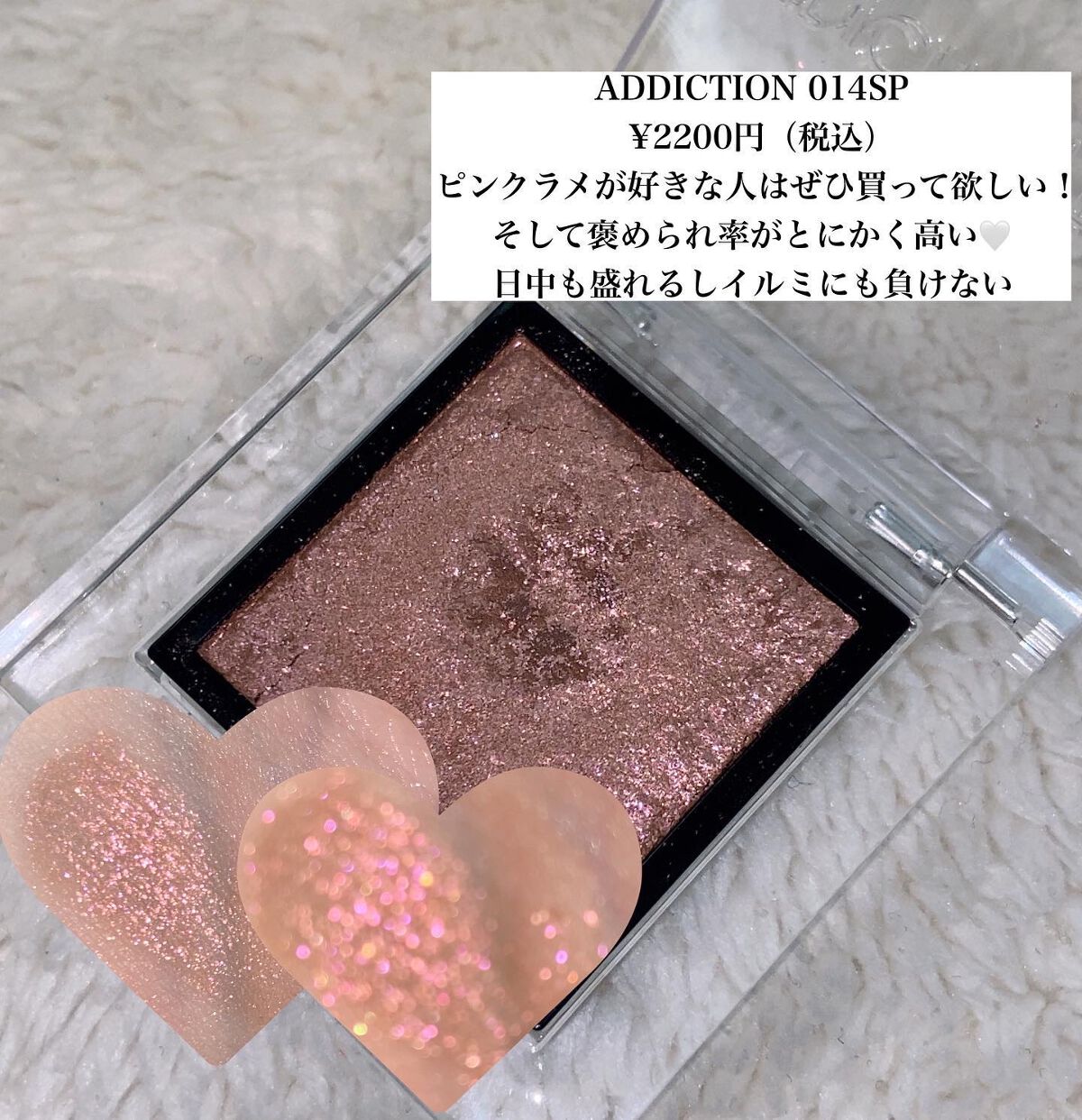 ゴールドラメが混ざったローズピンクカラーで冬の時期にぴったりの色味♡♡ 涙袋にのせると血色感出てぷっくり見えて最高に可愛いよ… 今年のクリスマスデートに絶対使いたい!!💓