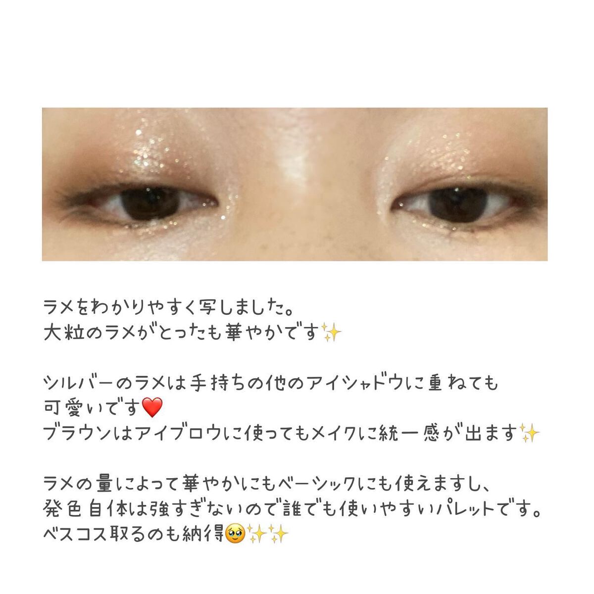 このパレットは、黄味が少なめでブルベにも使いやすいブラウン。 発色はしっかり目だけど、ブラシで調節も可能なので幅広い人に使いやすいパレットだと思います🎀✨ ラメ感も少しずつ異なり、華やかさを抑えたい時は右上を多めに使うと品の良いツヤのあるピンクブラウンメイクになります💎✨ 左上のラメカラーは白っぽいのでどんなアイシャドウとも相性抜群! この可愛い色味と煌びやかなラメは唯一無二です!