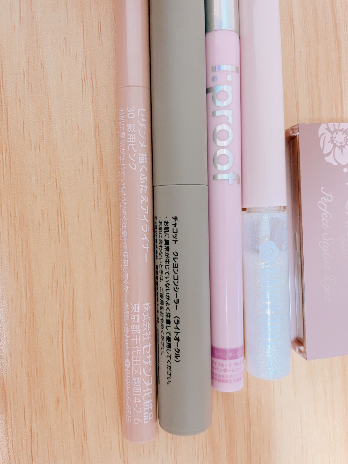 JILLSTUARTのコフレのアイシャドウパレットとセザンヌのパレット組みわせたよ😊 ほわっとした淡いピンク系カラーでナチュラルな目元ができた! クリームっぽい質感のアイシャドウベースが可愛いラメ感でほんと可愛いんですよ〜🩷ᩚ