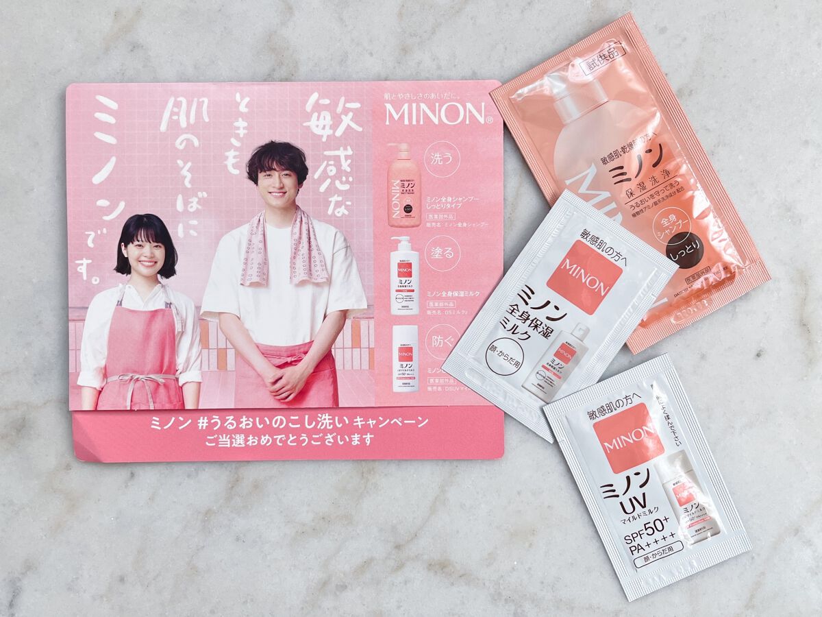 - <ミノンUVマイルドミルク> グリチルリチン酸2K、デカメチルシクロペンタシロキサン、低温焼成酸化亜鉛、パルミチン酸2-エチルヘキシル、微粒子酸化チタン、1,3-ブチレングリコール、メチルシロキサン網状重合体、リンゴ酸ジイソステアリル、グリセリルグルコシド液、メチルポリシロキサン、ポリヒドロキシステアリン酸、オクテニルコハク酸トウモロコシデンプンエステルアルミニウム、ポリオキシエチレン・メチルポリシロキサン共重合体、メチルハイドロジェンポリシロキサン、セスキイソステアリン酸ソルビタン、水酸化アルミニウム、架橋型メチルポリシロキサン、ラウロイルグルタミン酸ジ(コレステリル・ベヘニル・オクチルドデシル)、フェノキシエタノール、セスキオレイン酸ソルビタン、含水ケイ酸、グリコーゲン、コレステロール