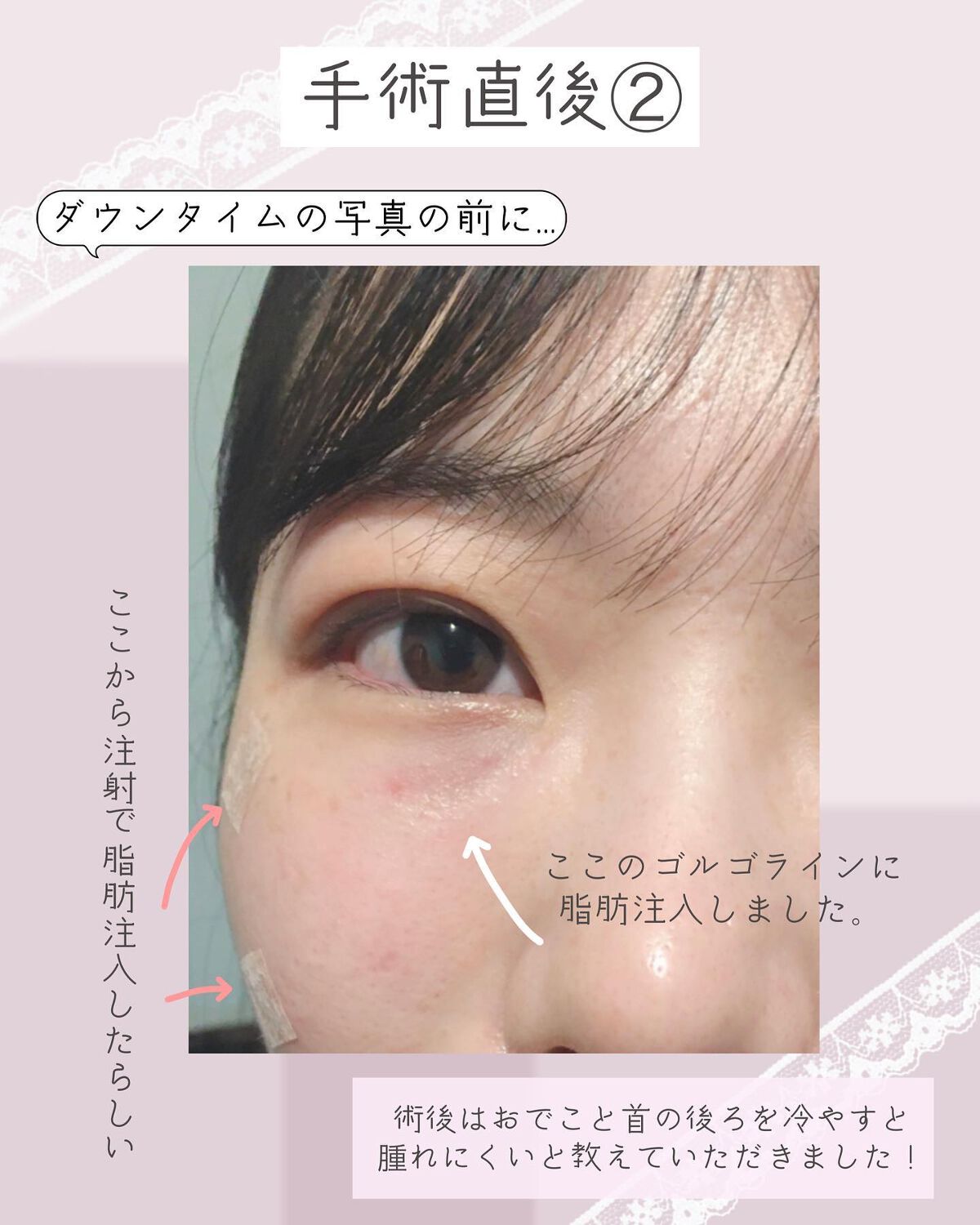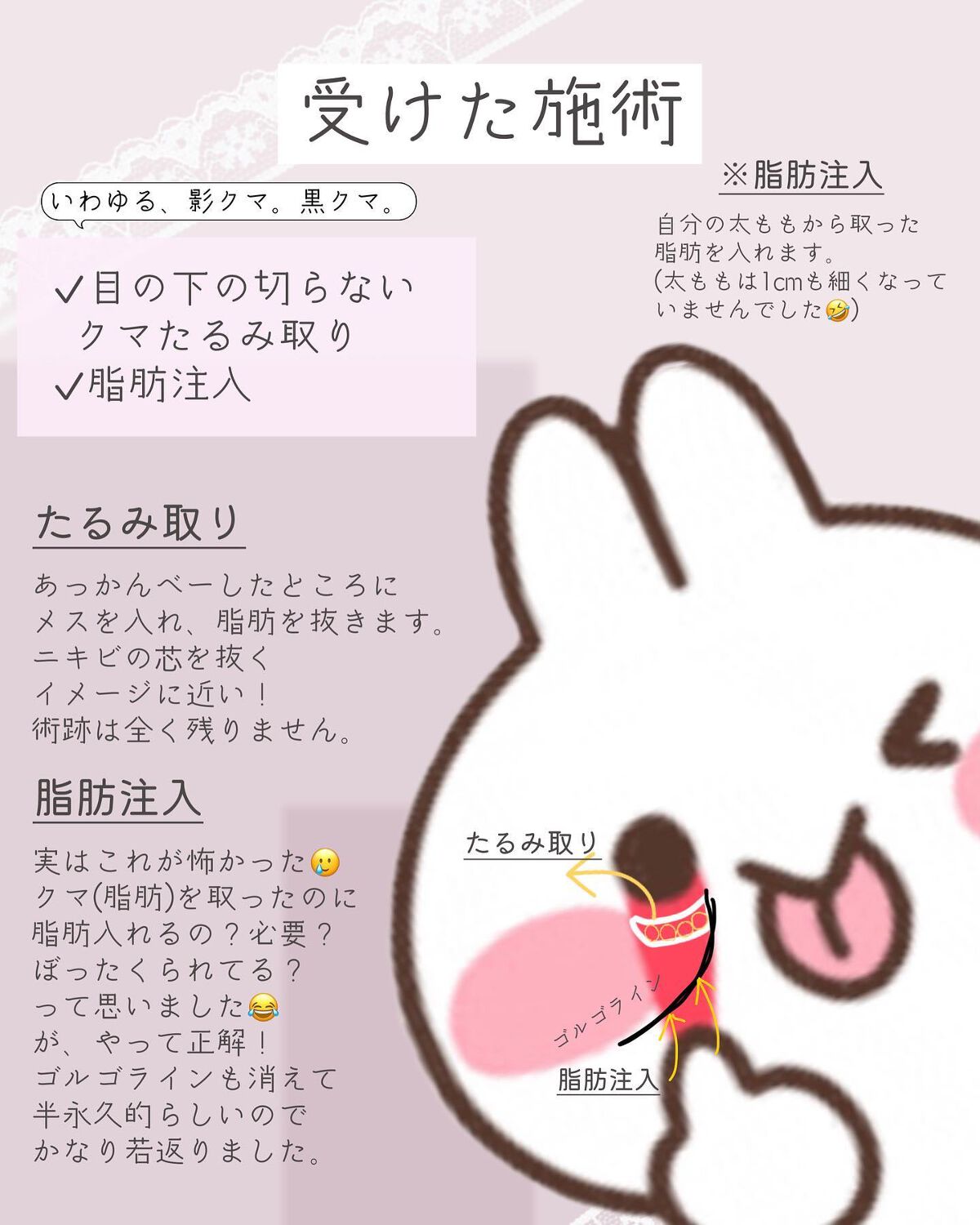 はじめまして!私も右目だけなんですが、数ヶ月前にくまとりして脂肪注入なしでしたのですが、やはり凹みが気になり後から別の美容クリニックで脂肪注入しました! クマとり脂肪注入して大正解でした☺︎ (脂肪注入って怖いイメージありました!私も!でも眠っている状態で全く痛みありませんでした!) ぴーちゃさん目元すごく可愛いですね❤︎悩みが解消してよかったですね☺︎