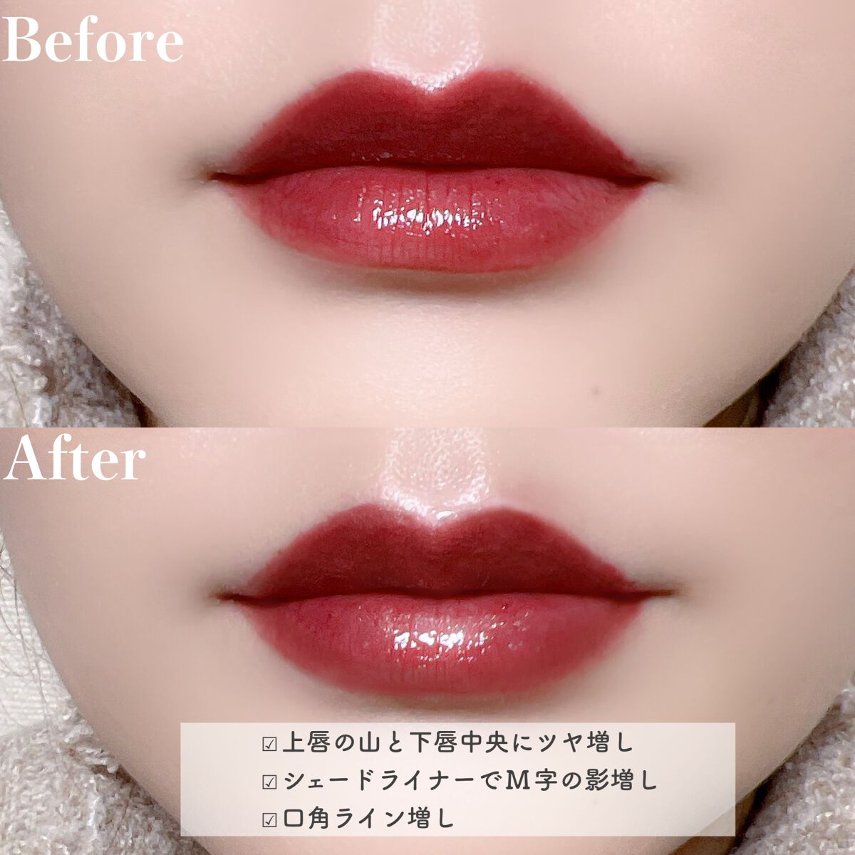 簡単2ステップ! ボリュームのある立体的なぷっくりとしたリップ(M字リップ) & 口角がアップしたかの様な印象のリップが簡単に作れちゃいます!👄←まさにこんな感じ。 「M字リップ偽装スティック」で、立体的なM字リップを簡単に作る🙆🏻♀️ ⚫︎「M字リップを偽装するシェードライナー」 ⚫︎「ボリュームアップするハイライターグロス」 👆🏻のWエンドになっております。 たったこれだけ🙆🏻♀️見た目の印象がまるで違う🥺! ぷっくり、ボリュームUPしたようなイメージに👄✨ 私は唇が薄めだったのでこういったアイテムがありがたい🙏 そして使いやすいし、簡単🫶🏻 これはヘビロテ確定だわ...