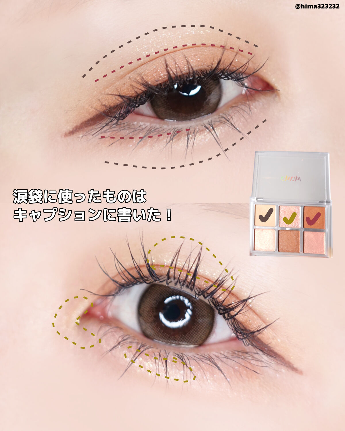 ①指でベタ塗りしない ②濃い色を広く入れすぎない ③目頭側に広く色を入れない ④下目尻は2色混ぜて使う ⑤色の境目はぼかすorラメをのせる ⑥涙袋の影は入れすぎない ⑦涙袋にラメを乗せすぎない ⑧マスカラ・グリッターはつける量を調節する ⑨マスカラのダマはコームでとかす ⑩アイラインは目尻だけ