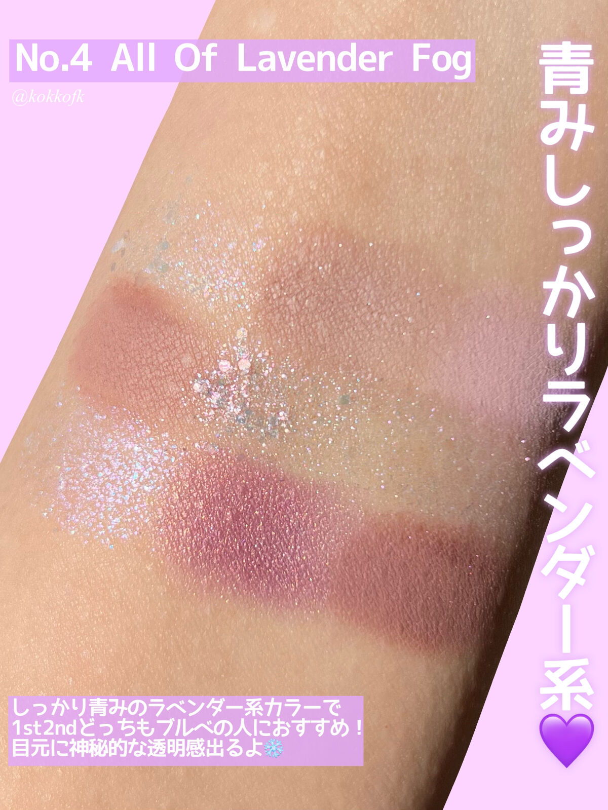 ラメ好きにはたまらないアンリシアのラベンダーパレット🎨💜 No.4 オールラベンダーフォグはくすみのあるグレーやラベンダーカラーを中心とした配色で、大小様々なグリッターやラメも入っているので色んなメイクが出来そう! 目元にのせると見た目より派手さはないので普段使いにも◎