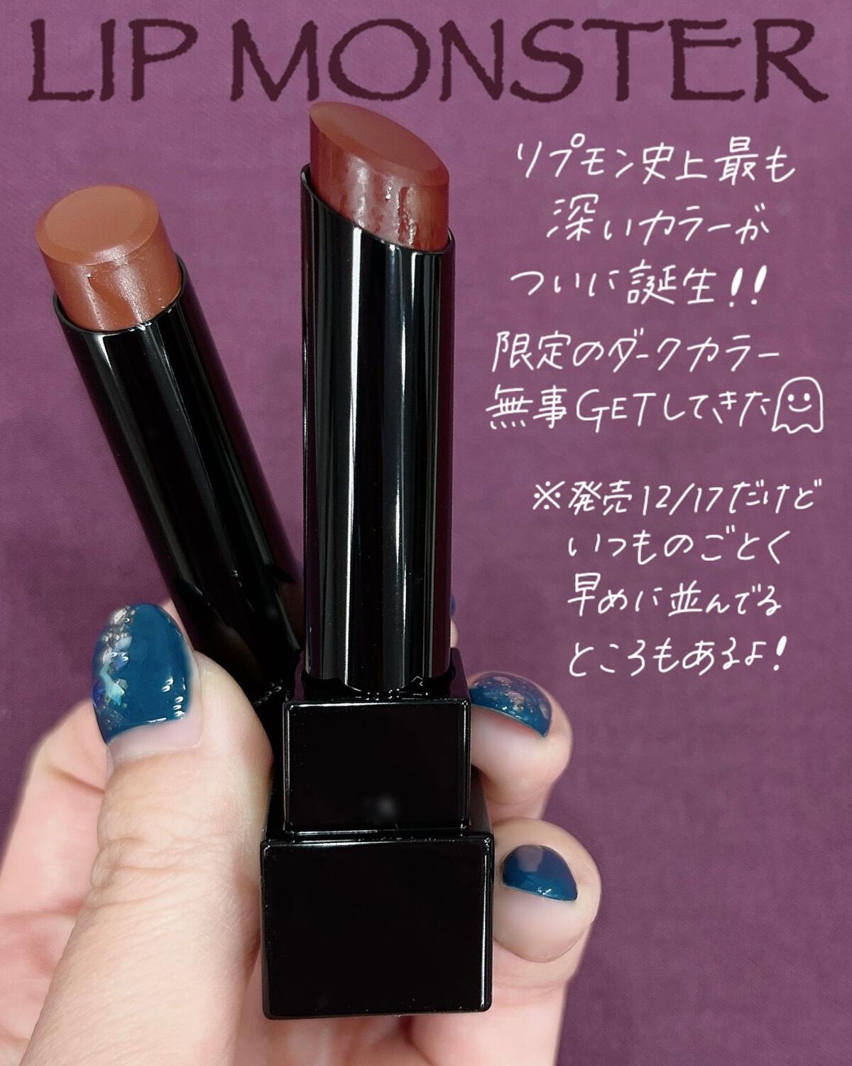 - 落ちにくさも美発色もよくばりたい、つけたての色が長時間持続する人気の口紅リップモンスター。 唇から蒸発する水分を活用して密着ジェル膜に変化する独自技術※で、つけたての色が長時間持続。 高発色&保湿。 ※当社独自の色持ち技術 ■花火のようにまぶしくきらめく 繊細なラメが際立つ限定色 EX-6 ピンクカラー×青ラメ【ロケット花火流星群】 EX-7 オレンジカラー×黄&緑ラメ【100万発の線香花火】 EX-8 レッドカラー×緑ラメ【打ち上げ花火ブランコ】 ■深みレッド系カラーの限定色 EX-9 戦慄の喜笑 (限定色) EX-10 狂気の怒号 (限定色) 【2025クリスマスコフレ】 落ちにくいリップモンスターから、唇の血色感を底上げする ホリデーシーズン限定の熱感ニュアンスベージュ系カラー登場。 EX-11 紅煙宿る贈り物(限定色):ボルドーベージュ系 EX-12 盗まれた1224mの星光(限定色):キャメルベージュ系