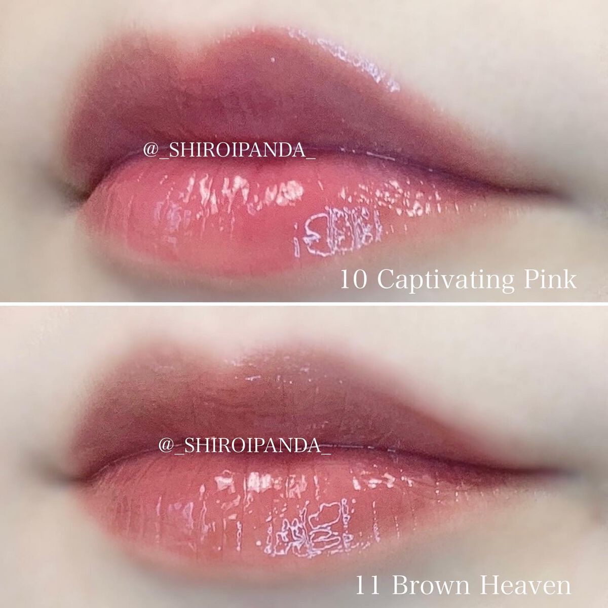 思ったより赤みのあるピンクで血色感があってつけやすくて可愛い🌸思ったより青みは強くなくコーラルっぽさも感じるのでPC関係なくナチュラルに使えそう☺️ モーヴ感強くて顔色悪くなるかな?と思ったけど塗ってみたらマイルドなオレンジブラウンのように発色した🍊ブラウンリップほど濃くないのでブルベさんでも使えるニュアンスブラウン🤎 とにかくちゅるるんとした唇になれるリップ🥹 食事をしたら取れちゃう感じだけど、塗り直しすれば問題なし🙆♀️ とにかくカラーとパケがかわいい🧚