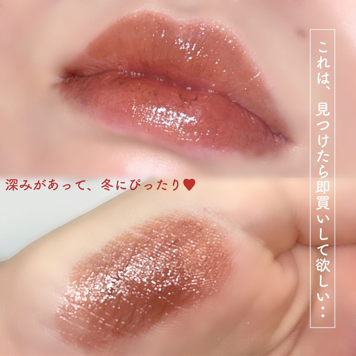 黄み強めのブラウン。ほんのり赤みも感じられるお洒落で絶妙カラー🍂 焦がした茶葉の余韻っていう名前がユニークで面白い☺︎ 限定色っていうのが勿体無いくらい使いやすいブラウンリップです。