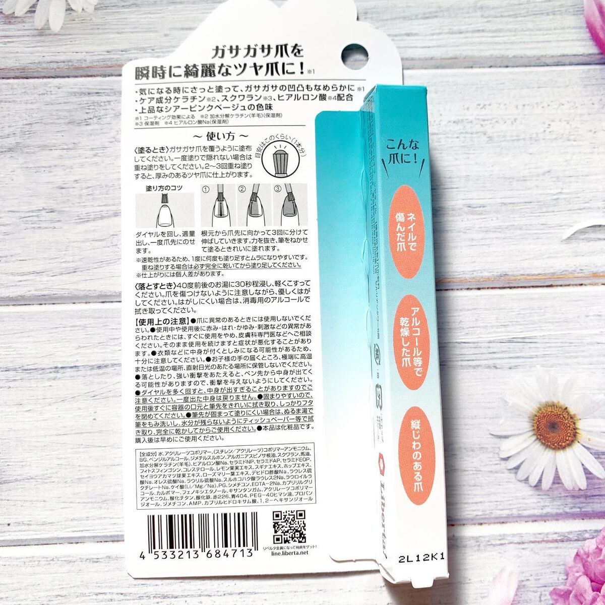 補強力はしっかりある よほど厚めに塗らなければ、乾くのは早い サラサラしていて塗りやすい ベースコートとしても使える 筆の液含みが良い 何かを塗ってる感はあり 磨いただけのツヤって感じではないので、ネイル禁止の職場の人や学生さんには向かない