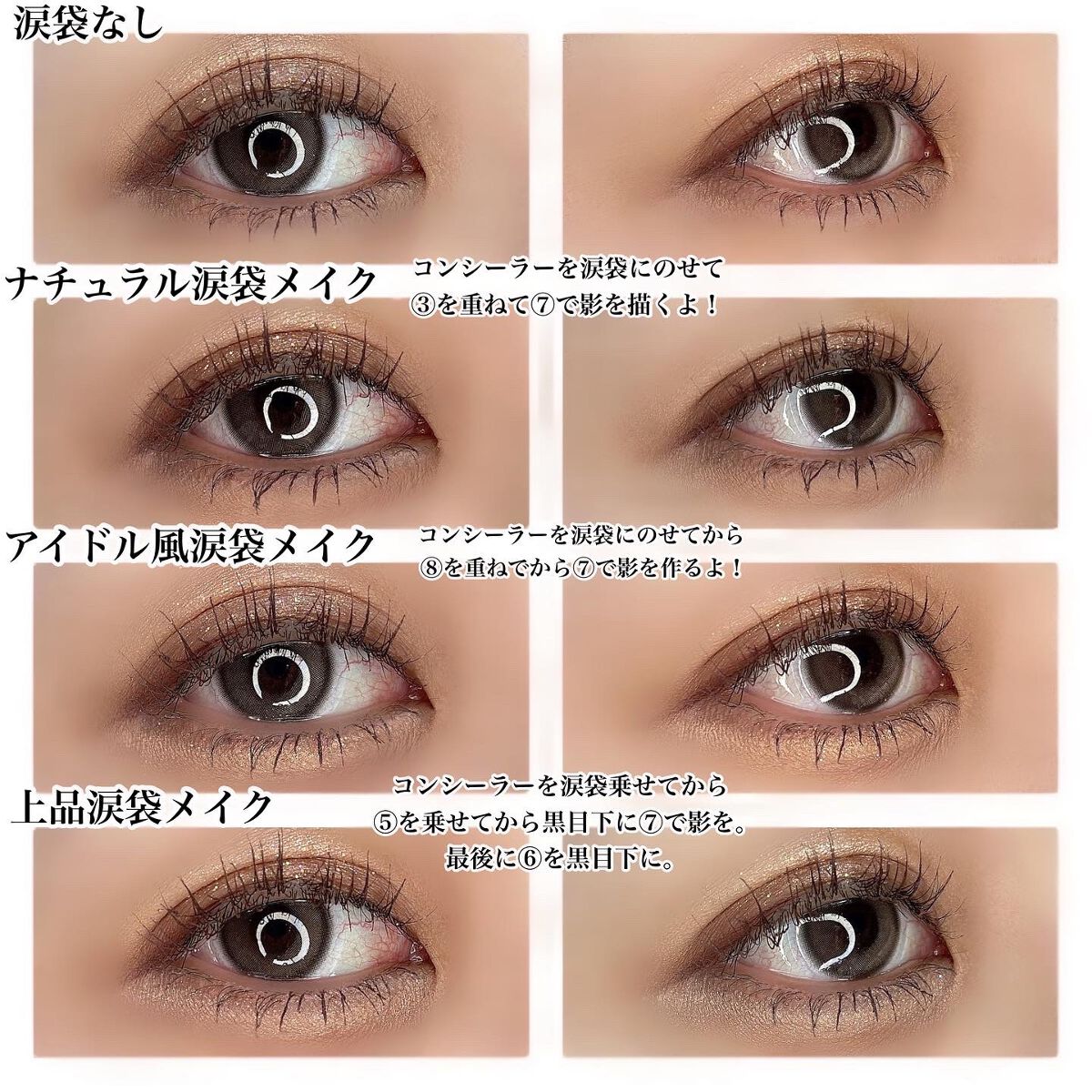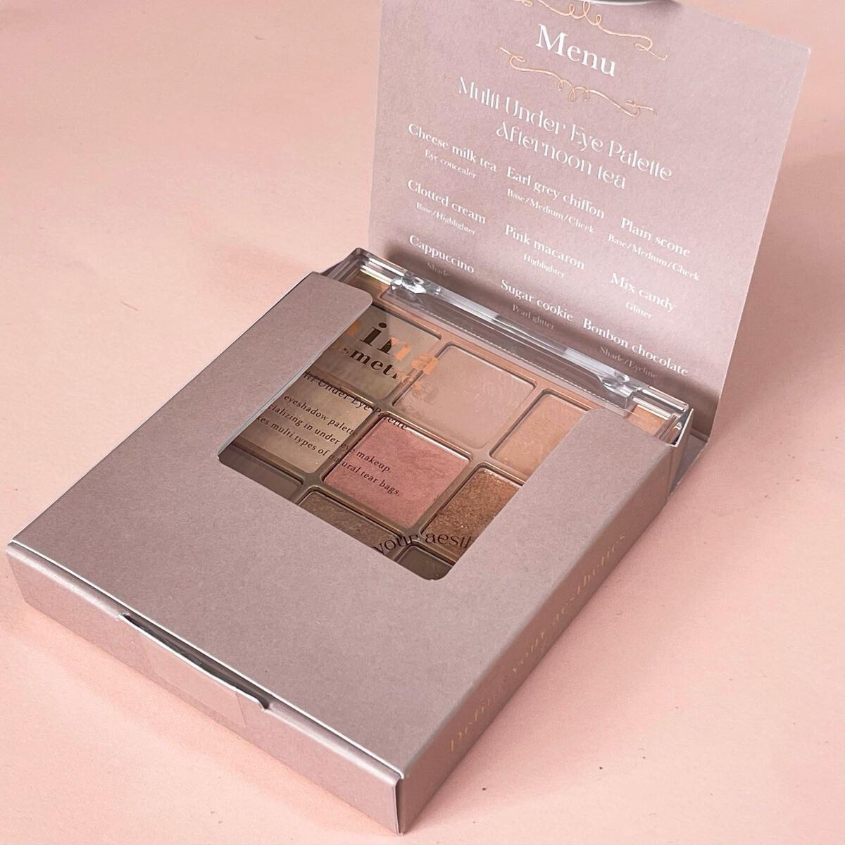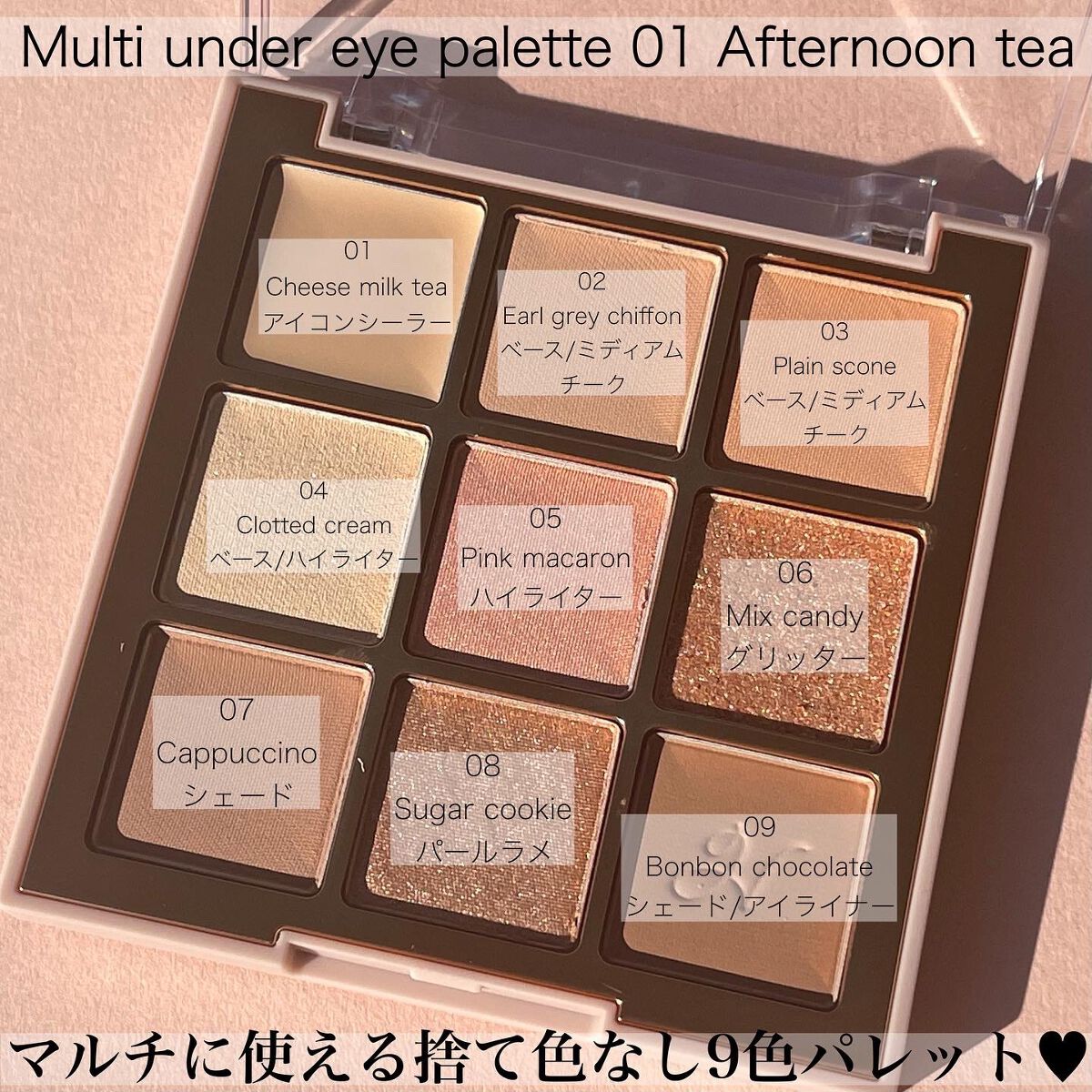 - 涙袋用コンシーラー入りの9色アイシャドウパレット。涙袋用コンシーラーや涙袋の影カラー、涙袋を立体的にみせるハイピグメントのラメやハイライターが入った9色パレットです。これ1つで様々なニュアンスの「涙袋メイク」や「下まぶたメイク」を楽しめます。
