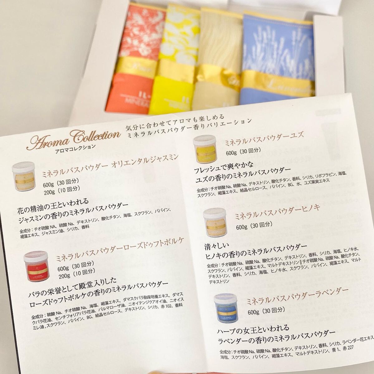 - 【アロマ5包】 <ミネラルバスパウダー オリエンタルジャスミン> チオ硫酸NA、硫酸Na、デキストリン、酸化チタン、海塩、スクワラン、パパイン、褐藻エキス、ジャスミン油、シリカ、香料 <ミネラルバスパウダー ローズドゥフトボルケ> 硫酸Na,チオ硫酸Na,海塩,褐藻エキス,ダマスクバラ胎座培養エキス,ダマスクバラ花油,センチフォリアバラ花油,パルマローザ油,ニオイテンジクアオイ油,ニオイスミレ油,スクワラン,パパイン,BG,結晶セルロース,デキストリン,シリカ,赤102,香料 <ミネラルバスパウダー ユズ> チオ硫酸Na、硫酸Na、デキストリン、酸化チタン、香料、シリカ、リボフラビン、海塩、スクワラン、褐藻エキス、結晶セルロース、パパイン、BG、水、ユズ果実エキス <ミネラルバスパウダー ヒノキ> チオ硫酸Na、硫酸Na、酸化チタン、デキストリン、香料、シリカ、海塩、ヒノキ水、スクワラン、パパイン、褐藻エキス、マルトデキストリン <ミネラルバスパウダー ラベンダー> チオ硫酸Na、硫酸Na、酸化チタン、デキストリン、香料、シリカ、ラベンダー花エキス、海塩、スクワラン、パパイン、褐藻エキス、マルトデキストリン、青1、赤227 【オリジナル5包】 硫酸Na・チオ硫酸Na・海塩・褐藻エキス・スクワラン・パパイン・デキストリン・ユーカリ葉油・銅クロロフィリンNa・香料