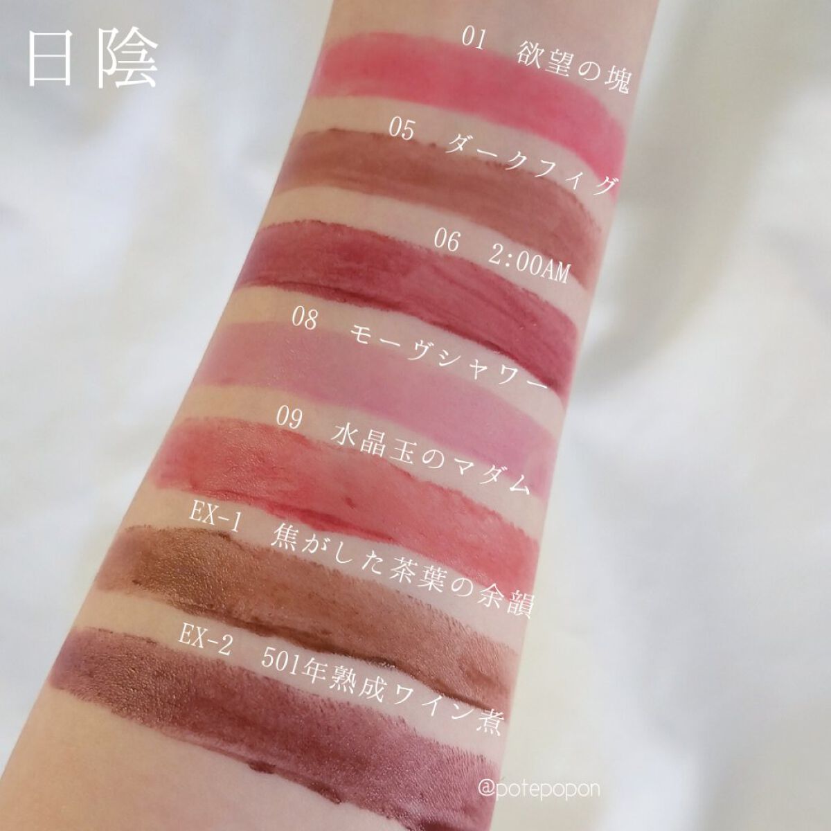 - <01 欲望の塊> テトライソステアリン酸ジペンタエリスリチル、トリ(カプリル酸/カプリン酸)グリセリル、オクチルドデカノール、ラウロイルグルタミン酸ジ(フィトステリル/オクチルドデシル)、ビスアルキル(C16-18)グリセリルウンデシルジメチコン、イソノナン酸イソトリデシル、水添ポリイソブテン、ラウロイルグルタミン酸ジ(オクチルドデシル/フィトステリル/ベヘニル)、パラフィン、合成ワックス、ダイマージリノール酸(フィトステリル/イソステアリル/セチル/ステアリル/ベヘニル)、マイクロクリスタリンワックス、水添マイクロクリスタリンワックス、ヒドロキシステアリン酸エチルヘキシル、トコフェロール、ホホバ種子油、オリーブ果実油、アーモンド油、(エチレン/プロピレン)コポリマー、ポリエチレン、ジメチコン、(+/-)(チタン/酸化チタン)焼結物、マイカ、ラウロイルアスパラギン酸Na、ラウロイルリシン、塩化亜鉛、酸化チタン、酸化鉄、水酸化Al、硫酸Ba、トリイソステアリン酸イソプロピルチタン、酸化スズ、ホウケイ酸(Ca/Al)、合成フルオロフロゴパイト、黄4、黄5、赤104(1)、赤201、赤202 <02 ピンクバナナ> テトライソステアリン酸ジペンタエリスリチル、トリ(カプリル酸/カプリン酸)グリセリル、オクチルドデカノール、ラウロイルグルタミン酸ジ(フィトステリル/オクチルドデシル)、ビスアルキル(C16-18)グリセリルウンデシルジメチコン、イソノナン酸イソトリデシル、水添ポリイソブテン、ラウロイルグルタミン酸ジ(オクチルドデシル/フィトステリル/ベヘニル)、パラフィン、合成ワックス、ダイマージリノール酸(フィトステリル/イソステアリル/セチル/ステアリル/ベヘニル)、マイクロクリスタリンワックス、水添マイクロクリスタリンワックス、ヒドロキシステアリン酸エチルヘキシル、トコフェロール、ホホバ種子油、オリーブ果実油、アーモンド油、(エチレン/プロピレン)コポリマー、ポリエチレン、ジメチコン、(+/-)(チタン/酸化チタン)焼結物、マイカ、ラウロイルアスパラギン酸Na、ラウロイルリシン、塩化亜鉛、酸化チタン、酸化鉄、水酸化Al、硫酸Ba、トリイソステアリン酸イソプロピルチタン、酸化スズ、ホウケイ酸(Ca/Al)、合成フルオロフロゴパイト、黄4、黄5、赤104(1)、赤201、赤202 <03 陽炎> テトライソステアリン酸ジペンタエリスリチル、トリ(カプリル酸/カプリン酸)グリセリル、オクチルドデカノール、ラウロイルグルタミン酸ジ(フィトステリル/オクチルドデシル)、ビスアルキル(C16-18)グリセリルウンデシルジメチコン、イソノナン酸イソトリデシル、水添ポリイソブテン、ラウロイルグルタミン酸ジ(オクチルドデシル/フィトステリル/ベヘニル)、パラフィン、合成ワックス、ダイマージリノール酸(フィトステリル/イソステアリル/セチル/ステアリル/ベヘニル)、マイクロクリスタリンワックス、水添マイクロクリスタリンワックス、ヒドロキシステアリン酸エチルヘキシル、トコフェロール、ホホバ種子油、オリーブ果実油、アーモンド油、(エチレン/プロピレン)コポリマー、ポリエチレン、ジメチコン、(+/-)(チタン/酸化チタン)焼結物、マイカ、ラウロイルアスパラギン酸Na、ラウロイルリシン、塩化亜鉛、酸化チタン、酸化鉄、水酸化Al、硫酸Ba、トリイソステアリン酸イソプロピルチタン、酸化スズ、ホウケイ酸(Ca/Al)、合成フルオロフロゴパイト、黄4、黄5、赤104(1)、赤201、赤202 <04 パンプキンワイン> テトライソステアリン酸ジペンタエリスリチル、トリ(カプリル酸/カプリン酸)グリセリル、オクチルドデカノール、ラウロイルグルタミン酸ジ(フィトステリル/オクチルドデシル)、ビスアルキル(C16-18)グリセリルウンデシルジメチコン、イソノナン酸イソトリデシル、水添ポリイソブテン、ラウロイルグルタミン酸ジ(オクチルドデシル/フィトステリル/ベヘニル)、パラフィン、合成ワックス、ダイマージリノール酸(フィトステリル/イソステアリル/セチル/ステアリル/ベヘニル)、マイクロクリスタリンワックス、水添マイクロクリスタリンワックス、ヒドロキシステアリン酸エチルヘキシル、トコフェロール、ホホバ種子油、オリーブ果実油、アーモンド油、(エチレン/プロピレン)コポリマー、ポリエチレン、ジメチコン、(+/-)(チタン/酸化チタン)焼結物、マイカ、ラウロイルアスパラギン酸Na、ラウロイルリシン、塩化亜鉛、酸化チタン、酸化鉄、水酸化Al、硫酸Ba、トリイソステアリン酸イソプロピルチタン、酸化スズ、ホウケイ酸(Ca/Al)、合成フルオロフロゴパイト、黄4、黄5、赤104(1)、赤201、赤202 <05 ダークフィグ> テトライソステアリン酸ジペンタエリスリチル、トリ(カプリル酸/カプリン酸)グリセリル、オクチルドデカノール、ラウロイルグルタミン酸ジ(フィトステリル/オクチルドデシル)、ビスアルキル(C16-18)グリセリルウンデシルジメチコン、イソノナン酸イソトリデシル、水添ポリイソブテン、ラウロイルグルタミン酸ジ(オクチルドデシル/フィトステリル/ベヘニル)、