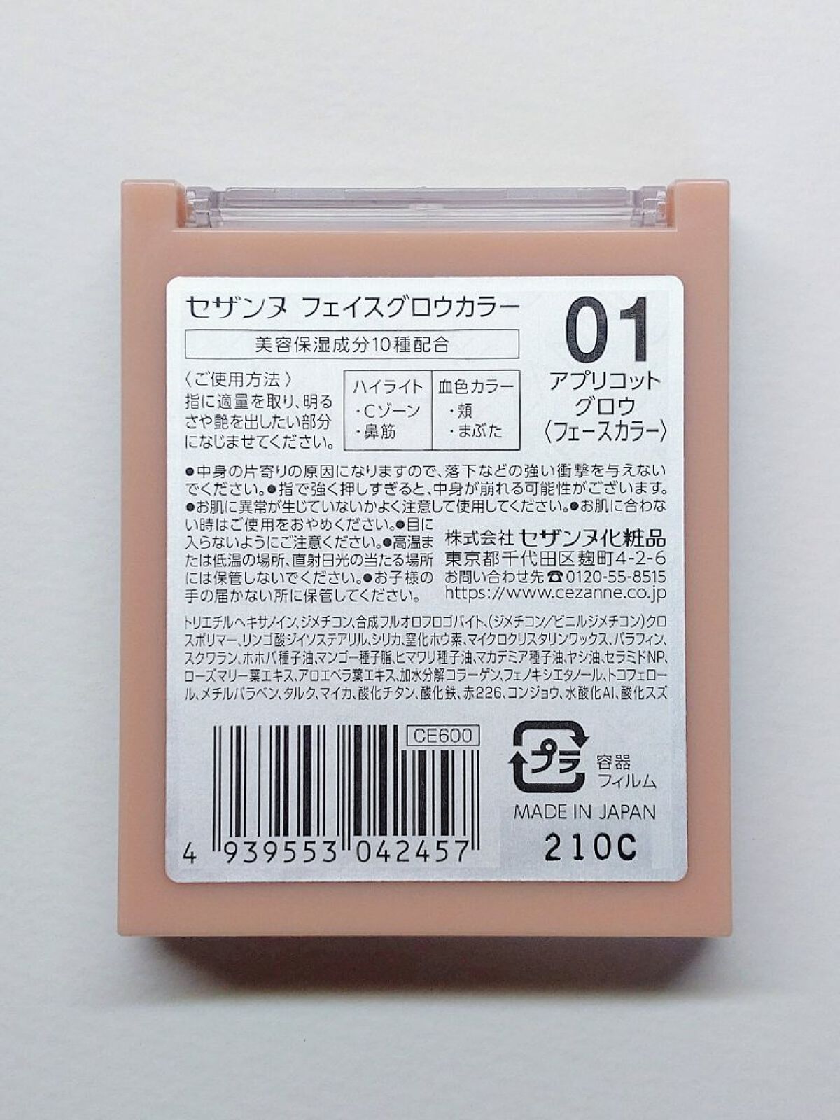 - <01 アプリコットグロウ> トリエチルヘキサノイン、ジメチコン、合成フルオロフロゴパイト、(ジメチコン/ビニルジメチコン)クロスポリマー、リンゴ酸ジイソステアリル、シリカ、窒化ホウ素、マイクロクリスタリンワックス、パラフィン、スクワラン、ホホバ種子油、マンゴー種子脂、ヒマワリ種子油、マカデミア種子油、ヤシ油、セラミドNP、ローズマリー葉エキス、アロエベラ葉エキス、加水分解コラーゲン、フェノキシエタノール、トコフェロール、メチルパラベン、タルク、マイカ、酸化チタン、酸化鉄、赤226、コンジョウ、水酸化Al、酸化スズ <02 ローズグロウ> トリエチルヘキサノイン、ジメチコン、合成フルオロフロゴパイト、(ジメチコン/ビニルジメチコン)クロスポリマー、リンゴ酸ジイソステアリル、シリカ、窒化ホウ素、マイクロクリスタリンワックス、パラフィン、スクワラン、ホホバ種子油、マンゴー種子脂、ヒマワリ種子油、マカデミア種子油、ヤシ油、セラミドNP、ローズマリー葉エキス、アロエベラ葉エキス、加水分解コラーゲン、フェノキシエタノール、トコフェロール、メチルパラベン、タルク、マイカ、酸化チタン、酸化鉄、赤226、コンジョウ、水酸化Al、酸化スズ、赤202 <03 ロマンスグロウ> トリエチルヘキサノイン、ジメチコン、合成フルオロフロゴパイト、(ジメチコン/ビニルジメチコン)クロスポリマー、リンゴ酸ジイソステアリル、シリカ、窒化ホウ素、マイクロクリスタリンワックス、パラフィン、スクワラン、ホホバ種子油、マンゴー種子脂、ヒマワリ種子油、マカデミア種子油、ヤシ油、セラミドNP、ローズマリー葉エキス、アロエベラ葉エキス、加水分解コラーゲン、フェノキシエタノール、トコフェロール、メチルパラベン、タルク、マイカ、酸化チタン、酸化鉄、赤226、コンジョウ、水酸化Al、酸化スズ、赤202 <SP1 ヨザクラグロウ> トリエチルヘキサノイン、ジメチコン、合成フルオロフロゴパイト、(ジメチコン/ビニルジメチコン)クロスポリマー、リンゴ酸ジイソステアリル、シリカ、窒化ホウ素、マイクロクリスタリンワックス、パラフィン、スクワラン、ホホバ種子油、マンゴー種子脂、ヒマワリ種子油、マカデミア種子油、ヤシ油、セラミドNP、ローズマリー葉エキス、アロエベラ葉エキス、加水分解コラーゲン、フェノキシエタノール、トコフェロール、メチルパラベン、タルク、マイカ、酸化チタン、酸化鉄、赤226、赤202、コンジョウ、グンジョウ、水酸化Al、酸化スズ