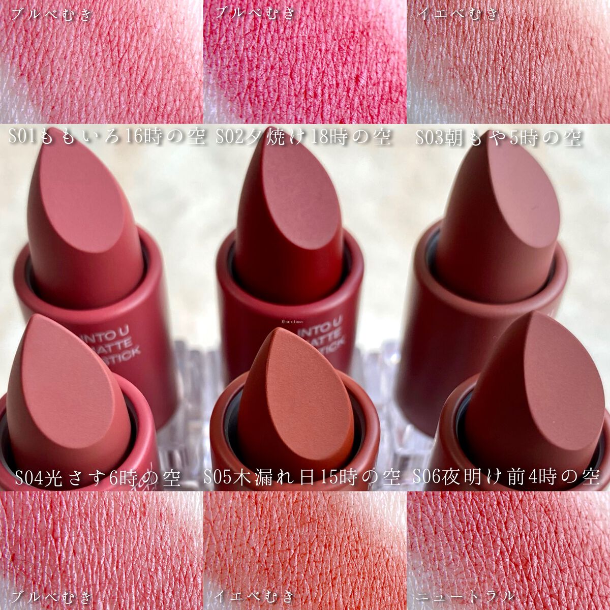 この「フェザーマットリップスティック」は、マットリップなんだけど保湿型オイル成分が配合されてるから、長時間つけてても乾燥しづらいんですって💋 まさに「フェザー」という名前にふさわしく、とてもふんわりとした付け心地で🕊マットリップにありがちな重たさを感じることはありません👍 ベタつかないのにカサつかず、唇の縦ジワが目立たないのも良きところ😍 しかも、マットリップ💄って結構パキッとした発色のものが多いと思うんだけど、この「フェザーマットリップスティック」は、発色が控えめなので、自分好みに濃さを調整しながら塗ることができるのです🙆🏻♀️ 現在は、✔️S01 ももいろ16時の空✔️S02 夕焼け18時の空✔️S03 朝もや5時の空✔️S04 光さす6時の空✔️S05 木漏れ日15時の空✔️S06 夜明け前4時の空(ネーミングが「時刻&空」になってるのね😧)という6色展開になってる「フェザーマットリップスティック」だけど、どれも使いやすそうで気になるお色ばかり🤩