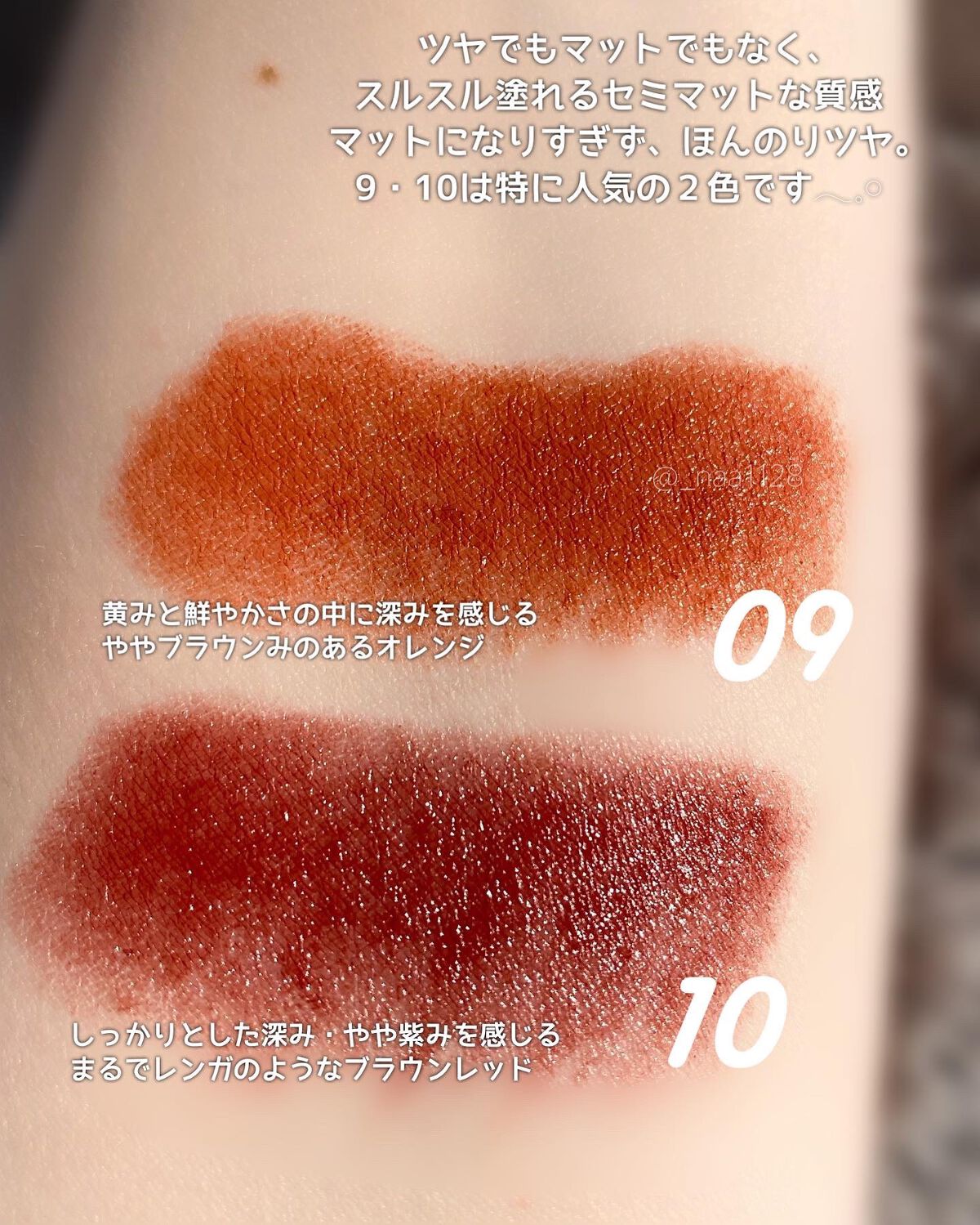 | 塗りたては結構ツヤツヤしてますが唇に塗るとマットに変身!! マットすぎず、グロスのようにツヤツヤし過ぎず使いやすい仕上がりでした👏 | 詳細を見る |