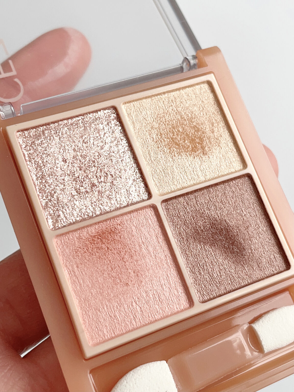 - ラメ・パール・マット3質感の4色アイシャドウ。 肌馴染みの良いベージュを基調としたカラー。ラメ・パール・マットの3質感を重ねて、自然にまぶたを強調し奥行のある大きな目元へ。 しっとり溶け込むような柔らかなパウダーなので、スルスル伸びてまぶたにピタッと密着。保湿成分(スクワラン・ホホバ種子油)配合。