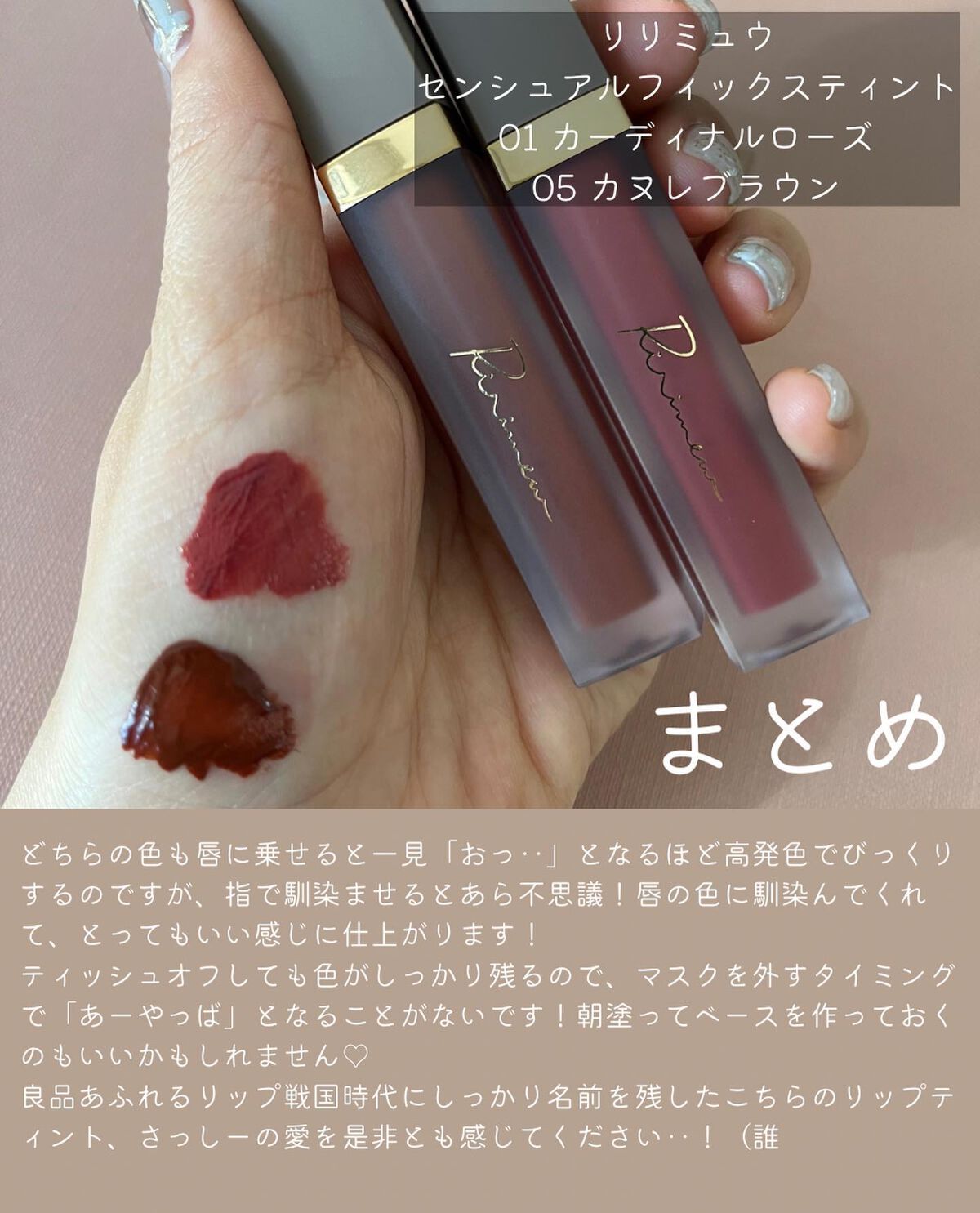 赤リップってやりすぎ感が出るというか、なんとなく唇だけ浮いちゃったりしませんか? 色味としては赤なんだけど、肌との馴染がいい! テクスチャーもツヤツヤで瑞々しくて、ものすごい使いやすいリップ そして、05カヌレブラウンは01に比べるともう少しブラウンよりなのでこちらも塗りすぎなければ超使いやすいブラウンリップです! この05は馴染む人(イエベさん)には馴染みすぎちゃって私の唇元々この綺麗な色です〜って感じになります! ただ塗りすぎ注意です!指でサササーっと整えるのがおすすめ♡